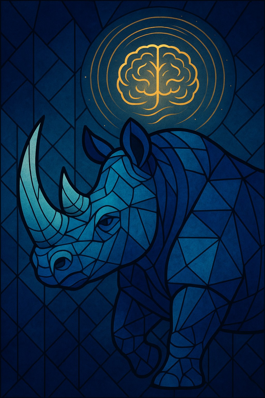 This stunning stained-glass mosaic features the “Mind Rhino,” a symbolic fusion of primal strength and intellectual clarity. The rhinoceros is rendered in sleek, angular tiles of cool blue and deep indigo, its powerful form outlined in bold black lines that lend a sense of structure and gravity. Above its head floats a glowing golden brain encased in concentric circular waves, radiating mental energy and enlightenment.