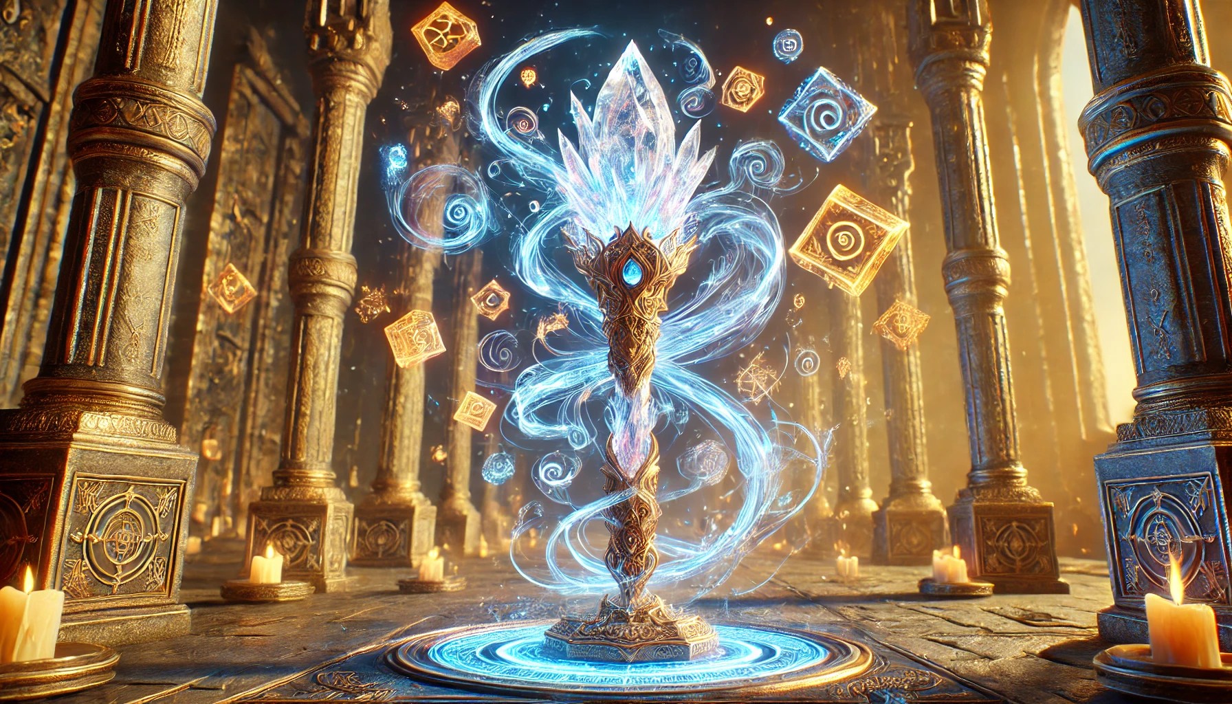 A high-definition image of a crystal scepter, shaped with intricate, otherworldly designs. The crystal features a glowing, swirling mind element energy, flowing like currents of thought around it. The scepter stands tall in the center, surrounded by floating golden runes and magical symbols.