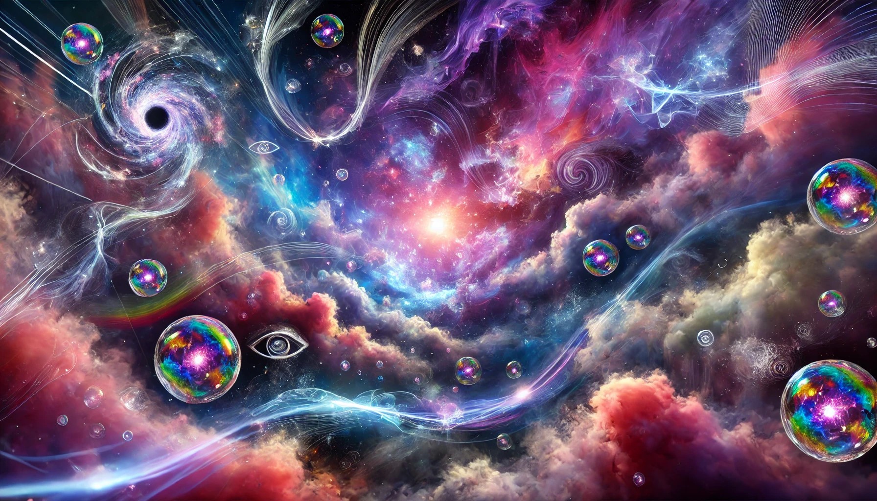 A surreal and abstract sky filled with swirling thoughts and dreams. Vibrant colors—deep purples, electric blues, and radiant pinks—blend together, resembling a vast cosmic brain. Floating, translucent orbs pulse with light, representing ideas and memories. The clouds twist and morph into shapes of symbols, eyes, and abstract forms, constantly shifting. Streams of glowing energy connect these floating thoughts, like neural pathways firing across the sky.