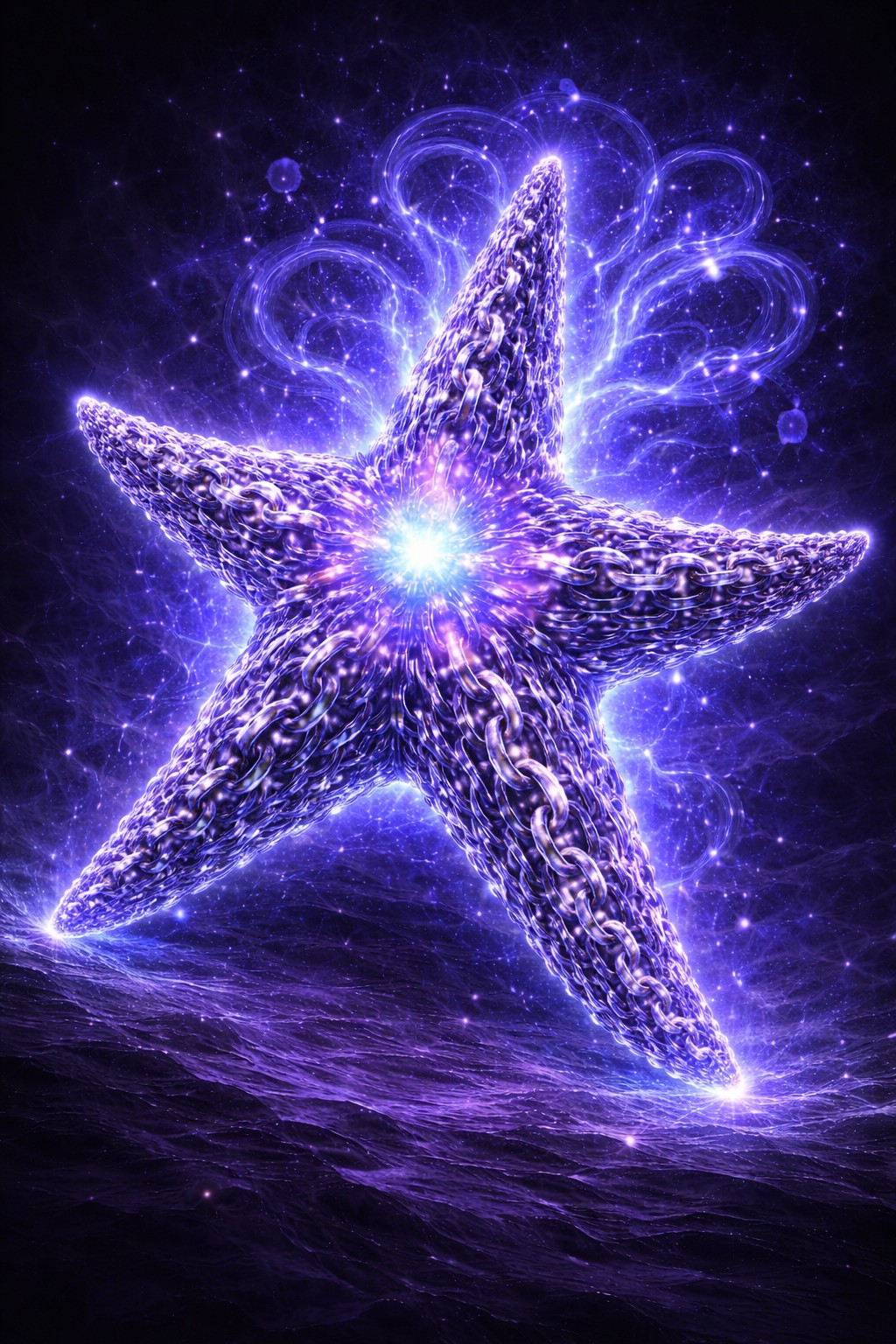The image depicts a mesmerizing starfish, crafted entirely from interwoven chains that shimmer with ethereal shades of purple and blue. At the center of the starfish, a glowing orb radiates an intense light, surrounded by swirling cosmic energy that gives it an otherworldly presence. The chains themselves seem to pulse with energy, their smooth metallic surface reflecting the luminous glow.