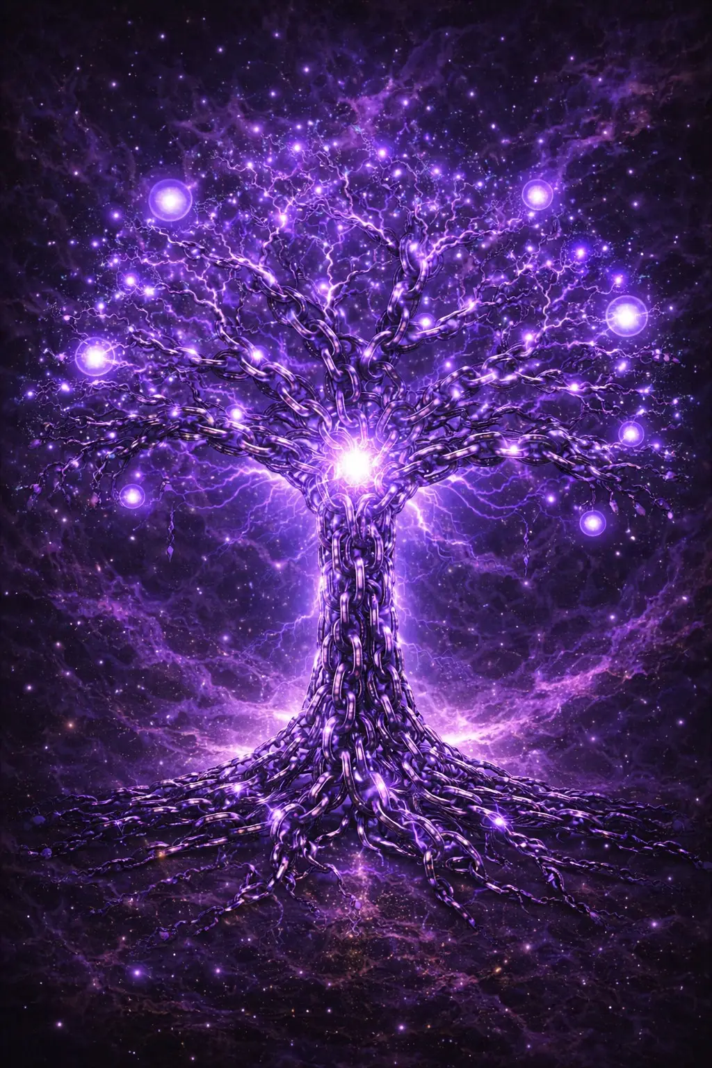 A towering “mind-element” tree rises from a bed of chain roots, its entire trunk and branching canopy forged from interlocking metallic links. Everything is bathed in rich violet light, as if psychic energy is flowing through the chains like living neural pathways—bright pulses travel along the branches, flaring at junctions like synapses firing. At the heart of the trunk, a brilliant violet-white core glows intensely, radiating soft waves of light that illuminate the surrounding links and cast a mystical aura.