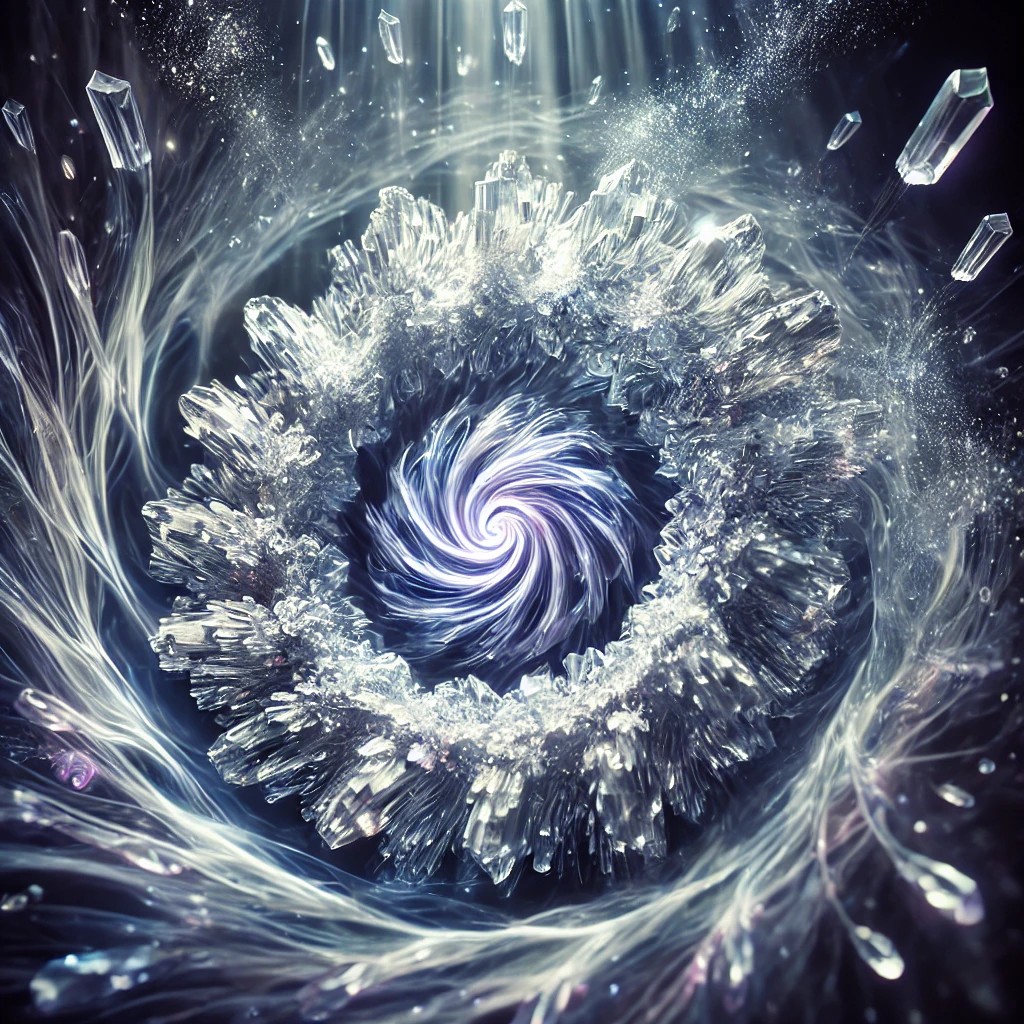 The image features a mesmerizing crystal vortex at its core, made of transparent quartz with delicate shimmering streaks of silver, blue, and purple that evoke a sense of swirling thought and psychic energy. The vortex spirals inward, with swirling crystalline shards that appear as though they are thoughts and ideas being drawn into the center.
