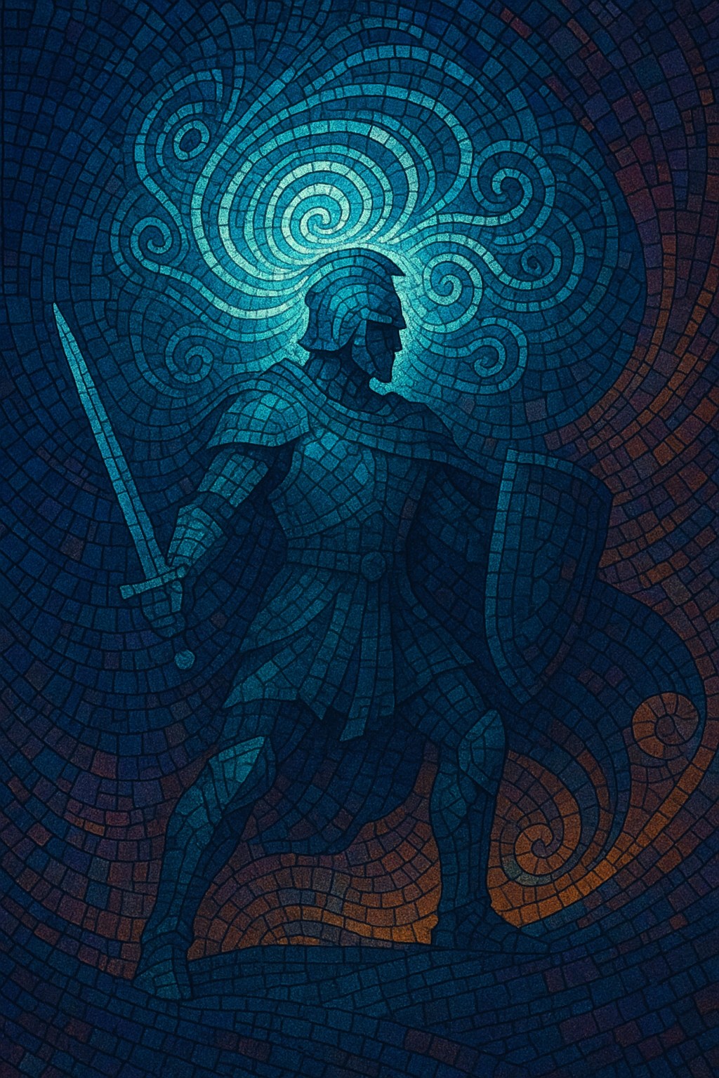 This digital abstract mosaic portrays a powerful warrior formed entirely from intricately arranged geometric tiles, with a striking emphasis on the “mind” element. Swirling patterns of light and energy radiate from the warrior’s head, suggesting mental strength, focus, and psychic power. The figure stands poised in classical armor, wielding a sword and shield, while the vibrant spirals and contrasting cool blues and warm oranges in the background create a dynamic, almost spiritual aura.