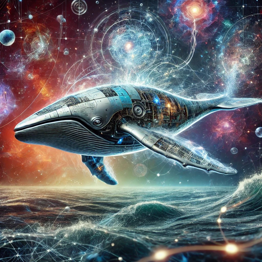 A mind whale automaton floats in a vast, cerebral ocean, its body an intricate blend of metal, glass, and neural networks.