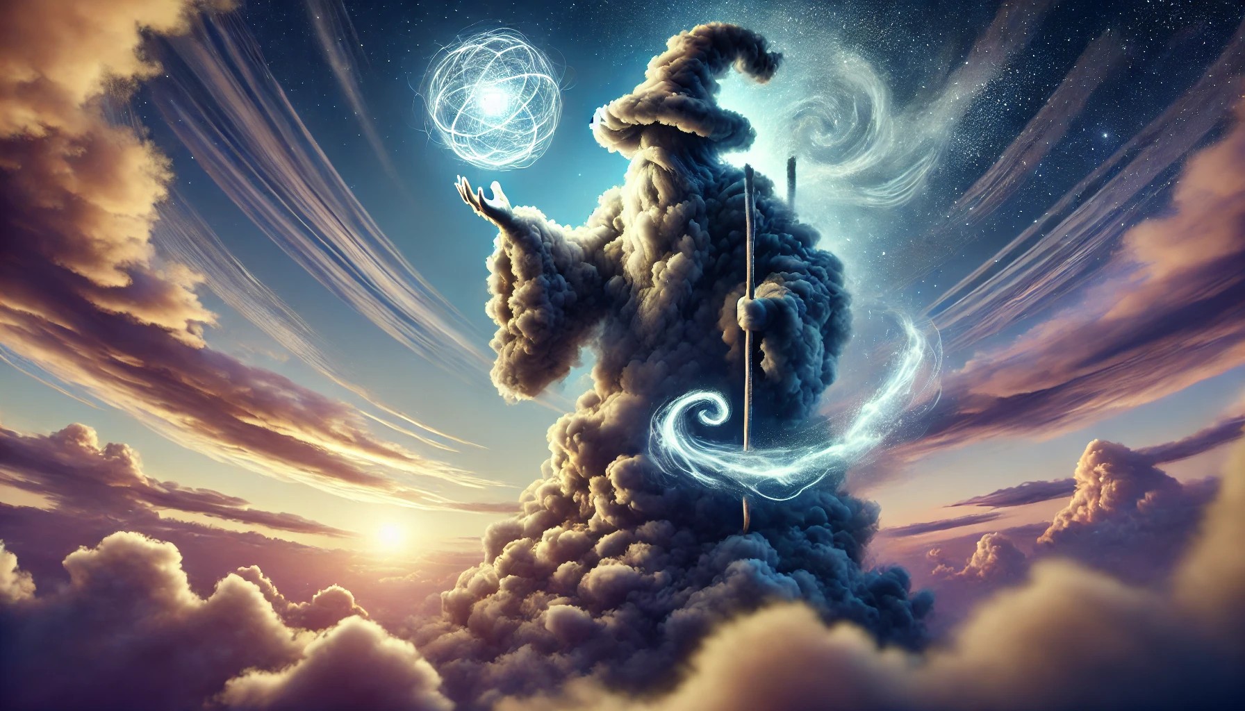 The image showcases a majestic cloud formation in the shape of a powerful wizard, standing tall against a twilight sky. The wizard’s body is sculpted from dense, swirling clouds, with a flowing cloud-based robe that cascades down like mist and a tall, pointed hat adding to its mystical appearance. Surrounding the wizard’s head is a glowing aura, symbolizing the mind element, with tendrils of thought-like energy spiraling outward across the sky.
