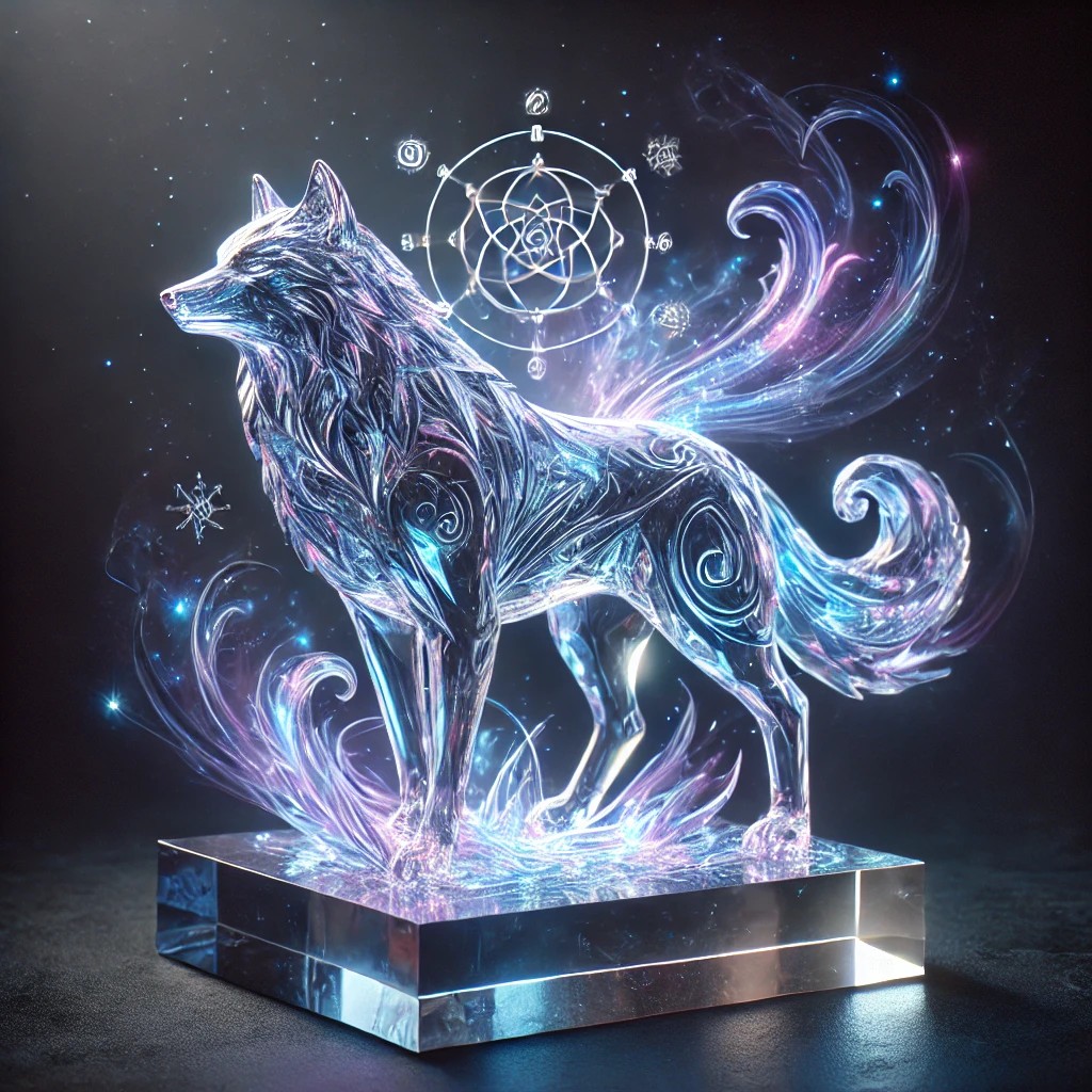 The image showcases a crystal sculpture of a wolf, intricately carved and glowing with an ethereal light. The body of the wolf is composed of translucent crystal, shimmering in deep blues and purples, creating a sense of mystical energy. Swirling patterns of psychic waves pulse through the crystal, symbolizing the “mind” element.