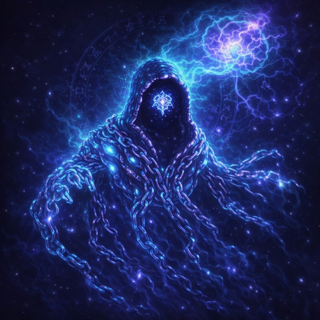 The chain-wraith hangs in the void like a torn shadow given shape, its entire form woven from heavy, glowing links of blue and violet metal. The chains drape and spiral into the outline of a hooded figure, sleeves stretching into long, clawed tendrils that trail off into mist. Where its face should be there’s only a depthless darkness filled with distant stars, and at the center of that abyss flickers a sharp, intricate sigil of light—like a burning, arcane neuron.