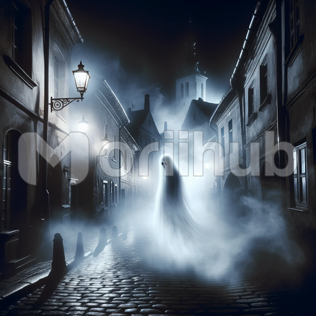 Amidst the enveloping mist of a desolate, darkened town, a ghostly white apparition materializes. Its spectral form glows with an eerie, ethereal light, hovering silently as if a lost soul seeking solace. The mist clings to its insubstantial figure, casting an otherworldly pallor. The air grows colder, and an unsettling stillness prevails, as this mysterious presence haunts the shadows of the misty, forgotten town.