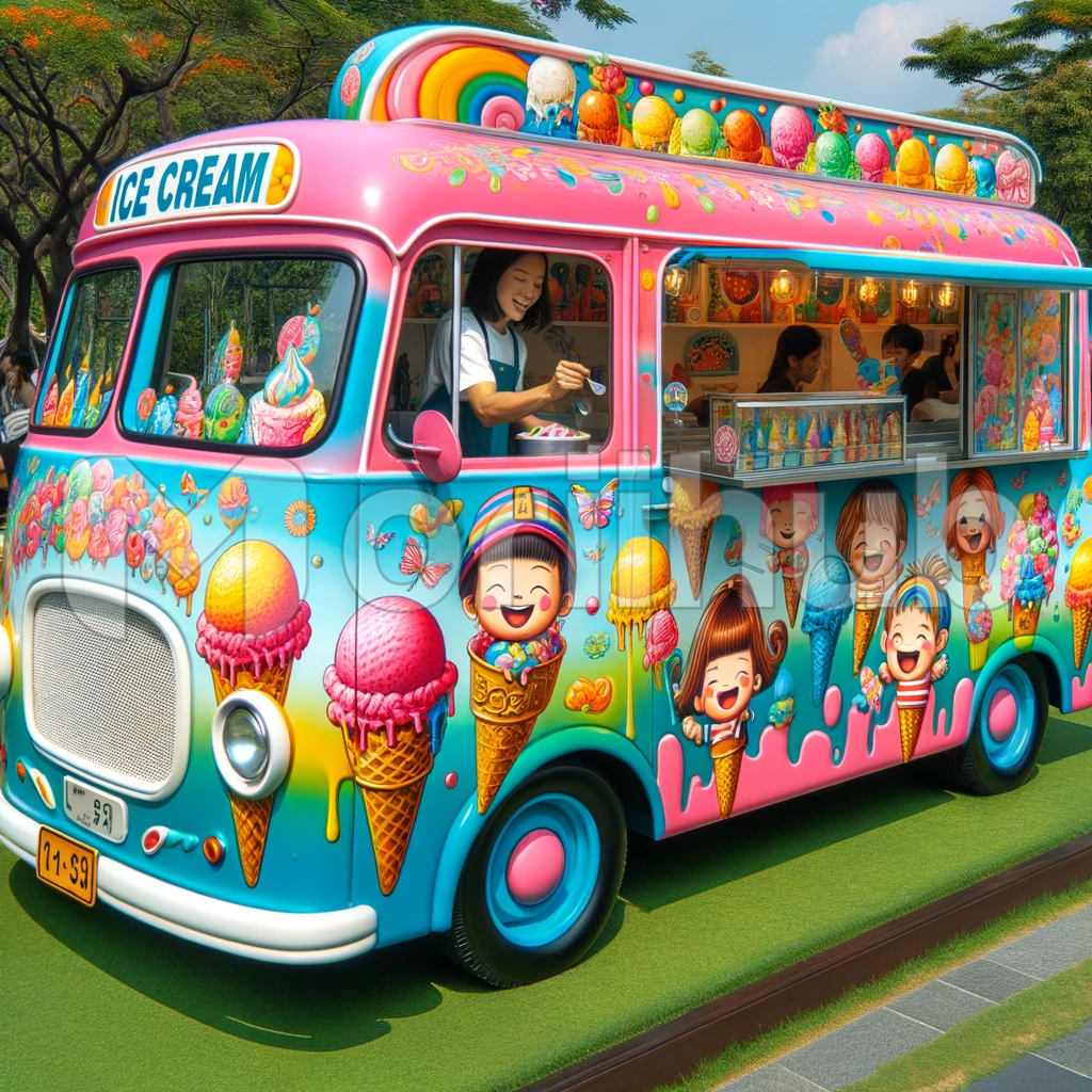 In this vibrant and lively scene, an ice cream bus becomes a rolling spectacle of color and joy. Its exterior is a riot of eye-catching shades, featuring bright pink, sky blue, sunny yellow, and fresh green. Each hue dances harmoniously, creating a mobile carnival that promises delightful frozen treats and a taste of pure happiness to all who approach. The ice cream bus is not just a vehicle; it’s a moving celebration of summertime sweetness and childhood dreams.