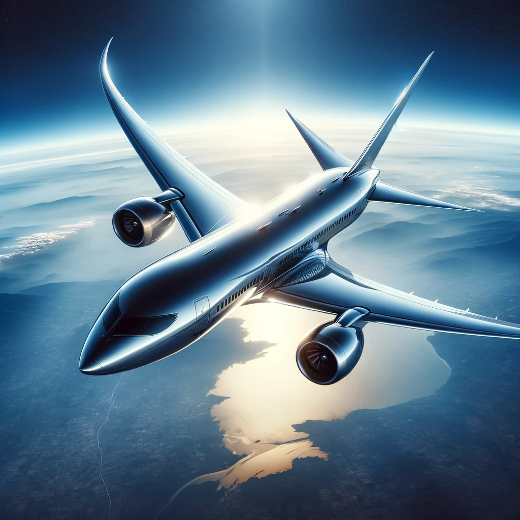 A sleek, modern airplane cuts through the clear blue sky with effortless grace. Its aerodynamic design, incorporating the latest advancements in aviation technology, ensures smooth, streamlined flight. Against the backdrop of endless azure, the aircraft symbolizes human ingenuity and the boundless possibilities of modern air travel.