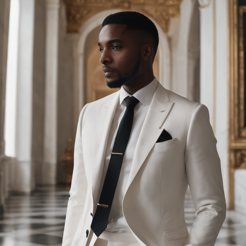A black man emanates timeless elegance in a crisp white suit and tie ensemble. The immaculate tailoring accentuates his refined silhouette, while the contrast of black tie adds a touch of sophistication. Radiating confidence, he epitomizes a modern gentleman, seamlessly blending style and grace in a captivating fashion statement.