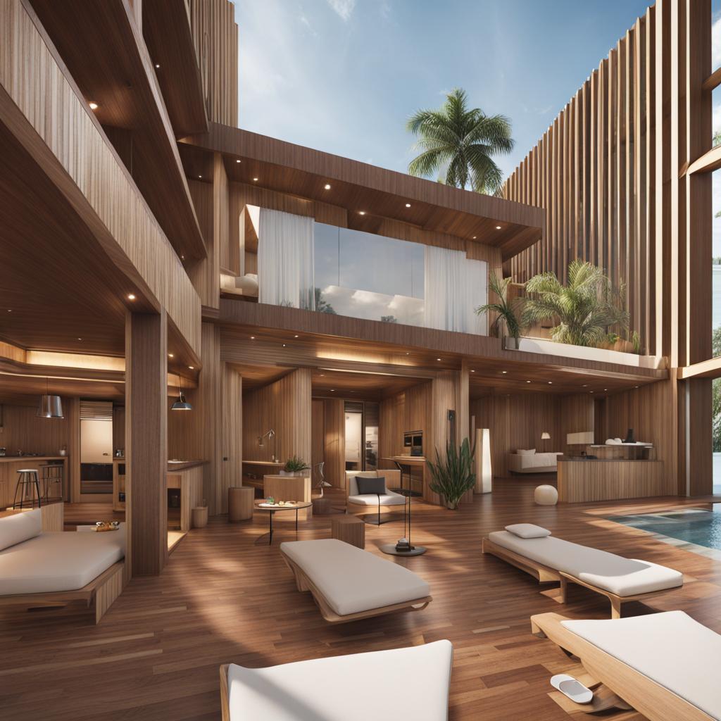 Immersed in nature, the modern wood design resort seamlessly blends luxury with organic charm. Expansive floor-to-ceiling windows frame lush surroundings, inviting the outdoors in. The warm tones of natural wood envelop every corner, creating a cocoon of comfort. Chic furnishings and minimalist elegance redefine relaxation in this contemporary woodland sanctuary.