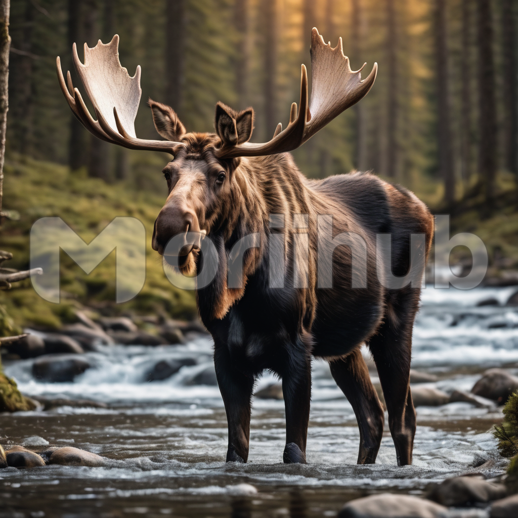 In the serene shallows of a winding river, a magnificent moose stands with an air of quiet contemplation. Its massive frame is a commanding presence as it gazes forward, eyes fixed on the distant horizon. The crystal waters reflect its noble form, creating a mesmerizing tableau of grace and strength. Amidst the tranquil embrace of nature, the moose embodies a silent sentinel, a symbol of unwavering determination and the serene beauty of the wild.