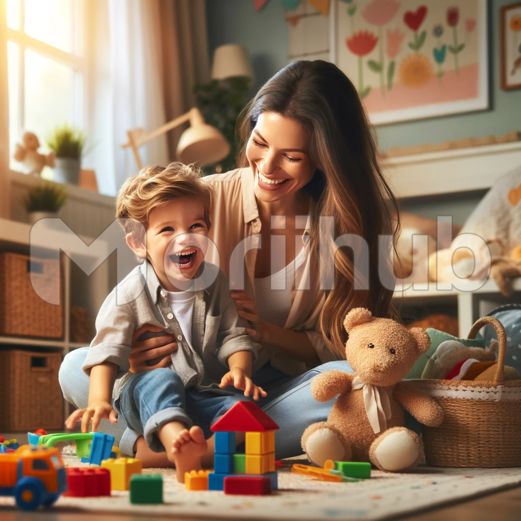 In this heartwarming image, a mother and her young son create a timeless moment of love and joy in a cozy room. The mother sits on the floor, her warm smile radiating happiness as she lovingly engages with her son. They’re surrounded by toys and soft cushions, creating an atmosphere of comfort and togetherness. The mother’s eyes sparkle with affection, mirroring her son’s gleeful expression as they share laughter and play. It’s a beautiful tableau of the unbreakable bond between parent and child, where the world outside melts away in the warmth of their connection.