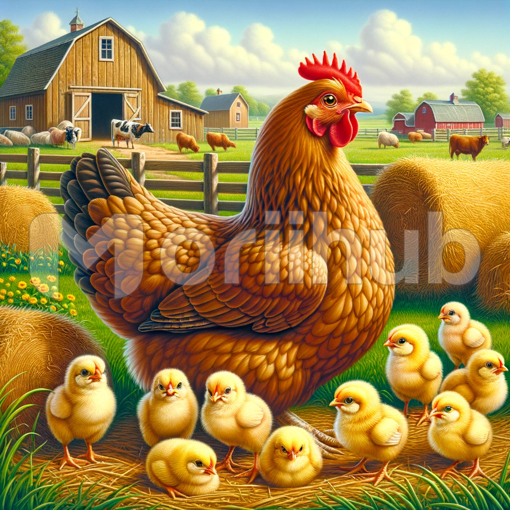 In the rustic ambiance of a farm, a heartwarming scene unfolds as a traditional brown hen, adorned with natural feather patterns, takes center stage. With a serene demeanor, she stands proudly among her brood of fluffy, chirping chicks, their downy feathers contrasting with her earthy plumage. The farm environment envelops them in a backdrop of simplicity and rustic charm, evoking a timeless connection to nature and the nurturing essence of farm life.