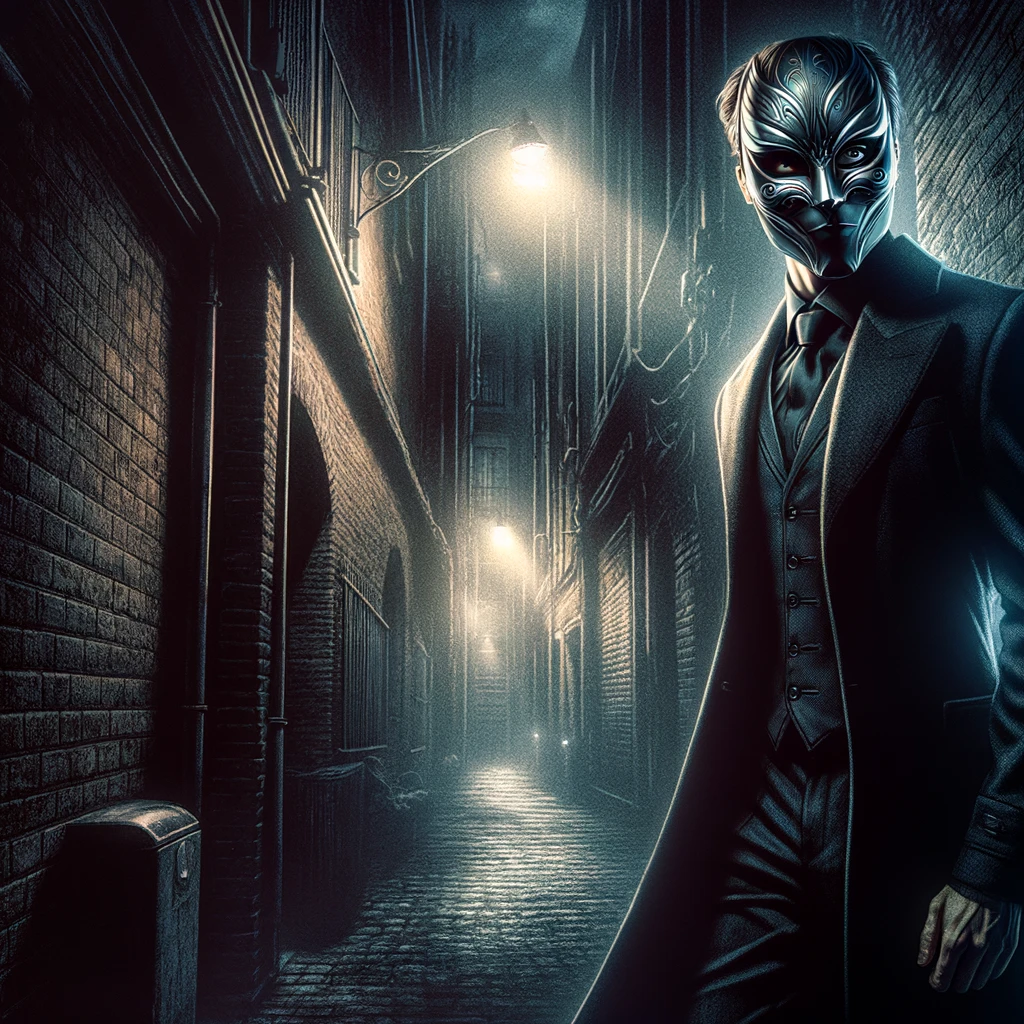 In the obscure depths of the night, a mysterious figure lurks in the shadows of an alleyway. Clad in a sleek, dark ensemble that melds seamlessly with the night, he exudes an air of enigma and intrigue. Behind the mask lies secrets untold, shrouded in the cloak of darkness, waiting to be unraveled.