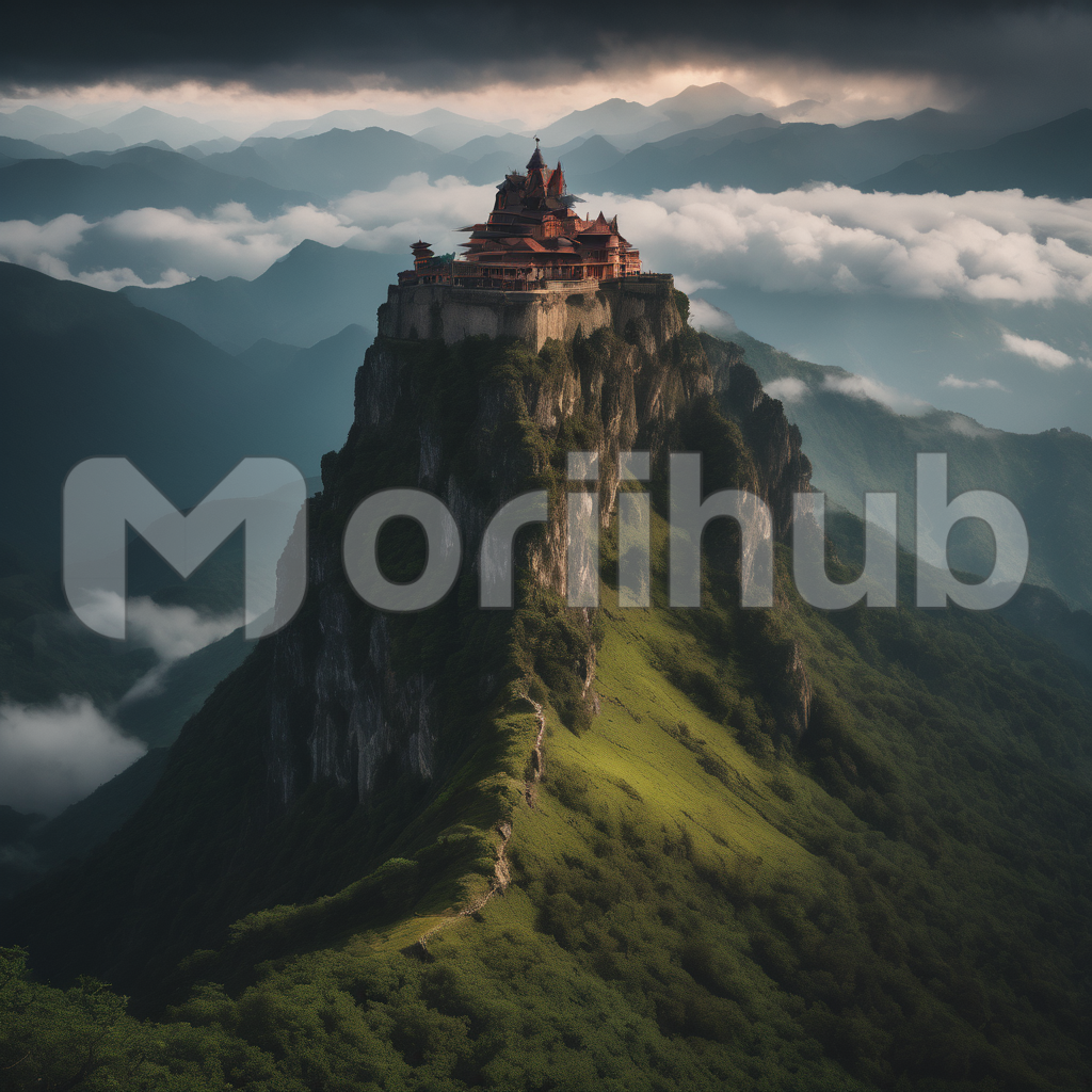 Nestled upon a towering mountain, an imposing castle commands the landscape, its silhouette stark against a backdrop of somber grey clouds. The fortress, constructed from age-old stone, exudes an aura of history and enigma. As mist swirls around the mountain’s craggy peaks, the castle stands as a sentinel, its presence emblematic of strength and mystery, casting a formidable and timeless shadow over the rugged terrain.