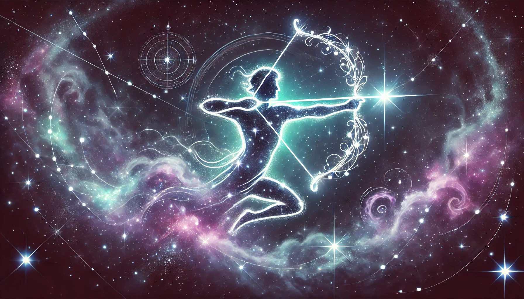 A digital illustration of a constellation shaped like an archer, pulling back a glowing, mystic energy bow.