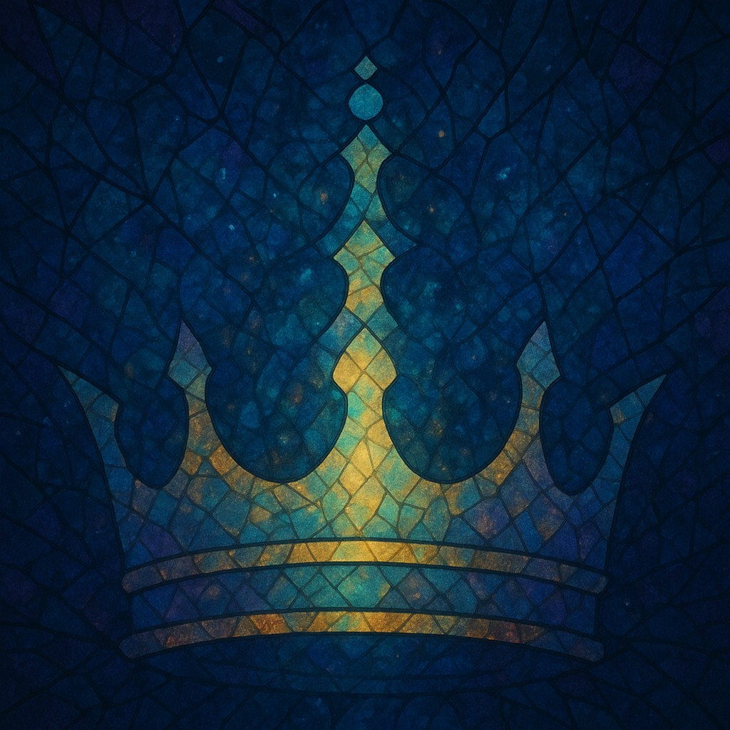 This image is a digital abstract mosaic designed in the shape of a crown, featuring a mystic, stained-glass style. The crown is rendered with geometric, polygonal pieces in golden, amber, and warm hues, symbolizing royalty and power. The background contrasts with deep blues, purples, and teals, creating a mystical and ethereal atmosphere.