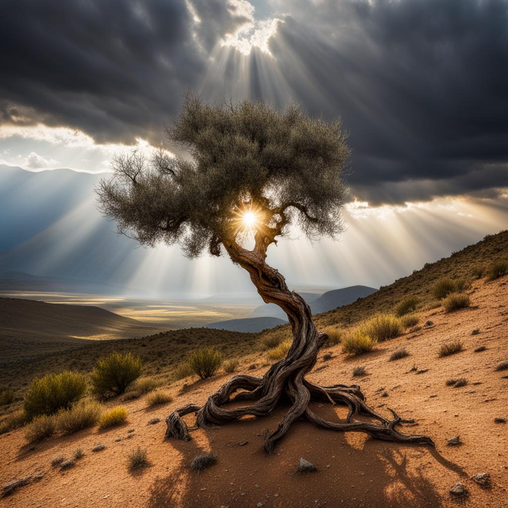 Atop a solitary hill, a lone tree stands resilient against the canvas of a moody sky. The sun, a timid protagonist behind billowing clouds, casts fleeting rays that delicately graze the tree’s silhouette. In this chiaroscuro dance, the solitary tree becomes a stoic sentinel, its branches bathed in the ephemeral glow. The atmospheric interplay creates a poignant scene, as the tree stands alone, kissed by sunlight, against the backdrop of brooding clouds, a testament to nature’s quiet poetry and the beauty found in solitude.