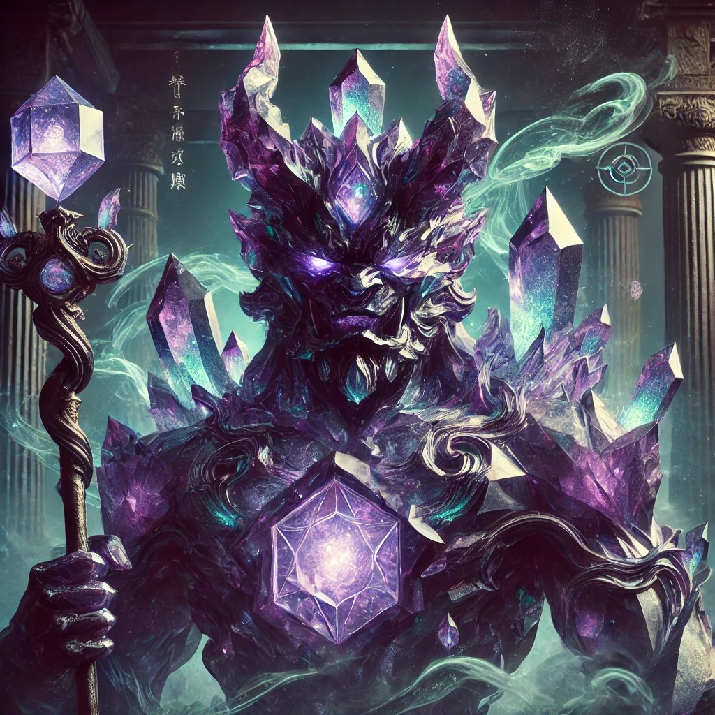 A crystalline sculpture of an oni, forged from deep violet and smoky quartz crystal, radiating an aura of ancient mysticism. The oni’s form is muscular and imposing, with sharp, angular facets and two curved horns emerging from its forehead. Its glowing eyes pierce through the mist, and its face carries a fierce yet wise expression, symbolizing a guardian of arcane secrets. The interior of the crystal structure shimmers with swirling patterns of indigo, teal, and silver—mystic energies coursing through its body like ethereal veins. The oni grips a staff crowned with a radiant gem, pulsating with magical light.