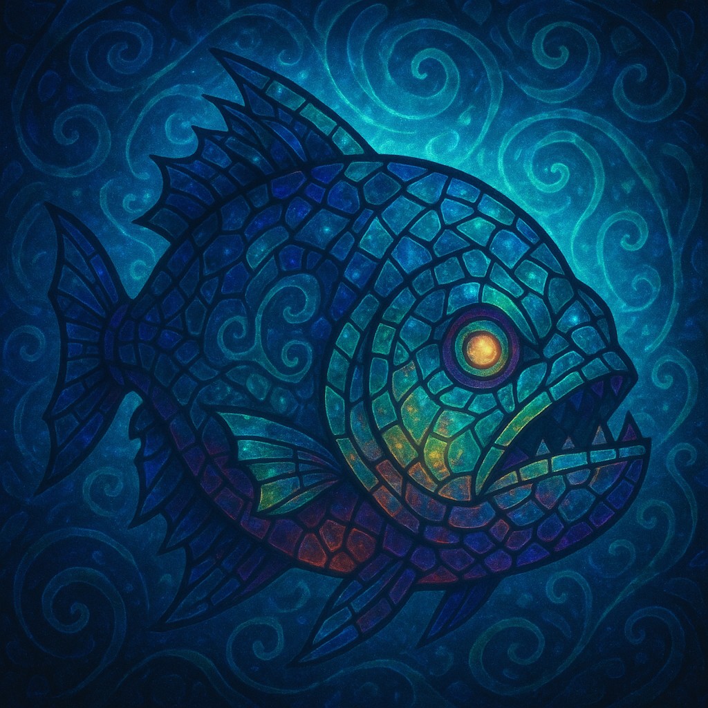This is a digital abstract mosaic artwork depicting a piranha in profile. The fish is composed of irregular, tile-like segments in deep blues, greens, purples, and fiery warm hues. Its eye glows with a mystical yellow-orange light, drawing focus and suggesting a supernatural or arcane presence. The background features swirling patterns in matching tones, enhancing the sense of motion and magical atmosphere.