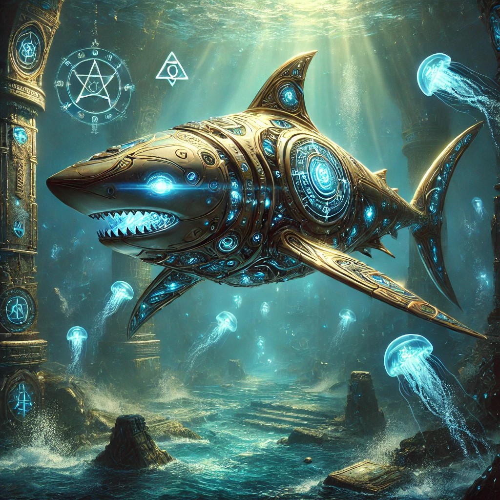 A mystical, mechanical shark gliding through an ethereal underwater world, its body made of polished brass and enchanted runes glowing faintly along its sleek metallic form.