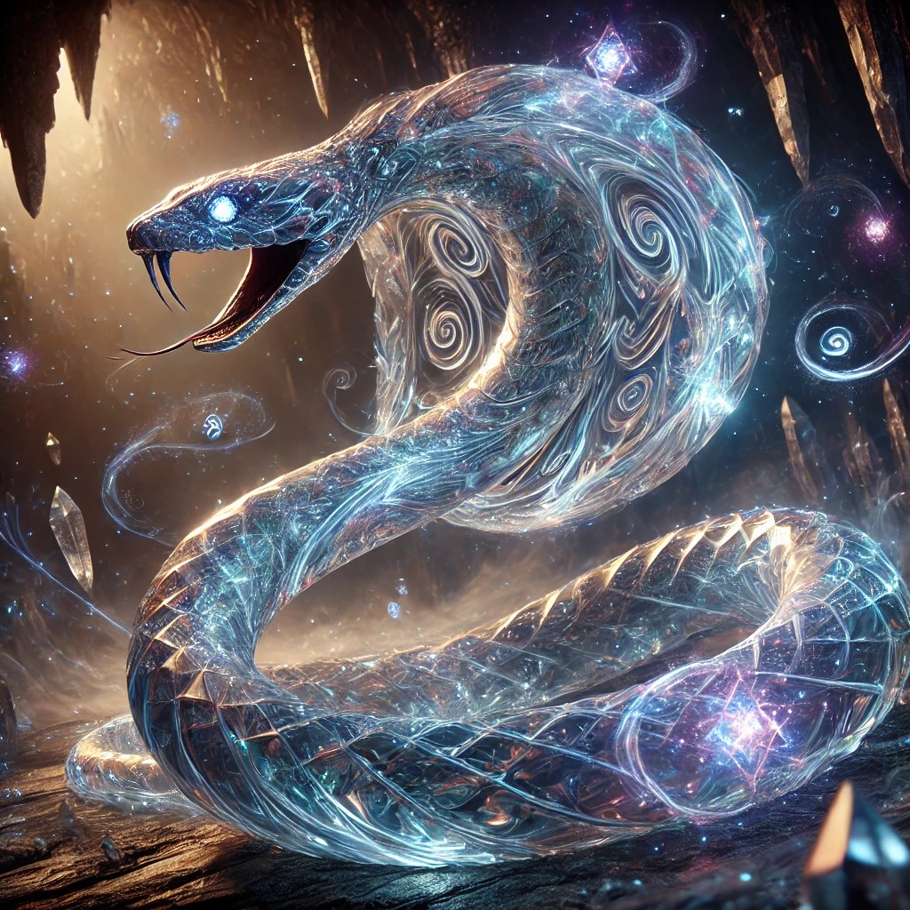 The image features a mesmerizing crystal snake infused with the mystic element, elegantly coiled within a glowing cavern. Its sinuous body is sculpted from translucent, shimmering crystal, with swirling patterns of arcane energy pulsing through its scales. The snake’s piercing eyes radiate an ethereal glow, exuding an aura of ancient wisdom and power. Its sleek form shifts between deep purples, blues, and silvers, reflecting an otherworldly light.