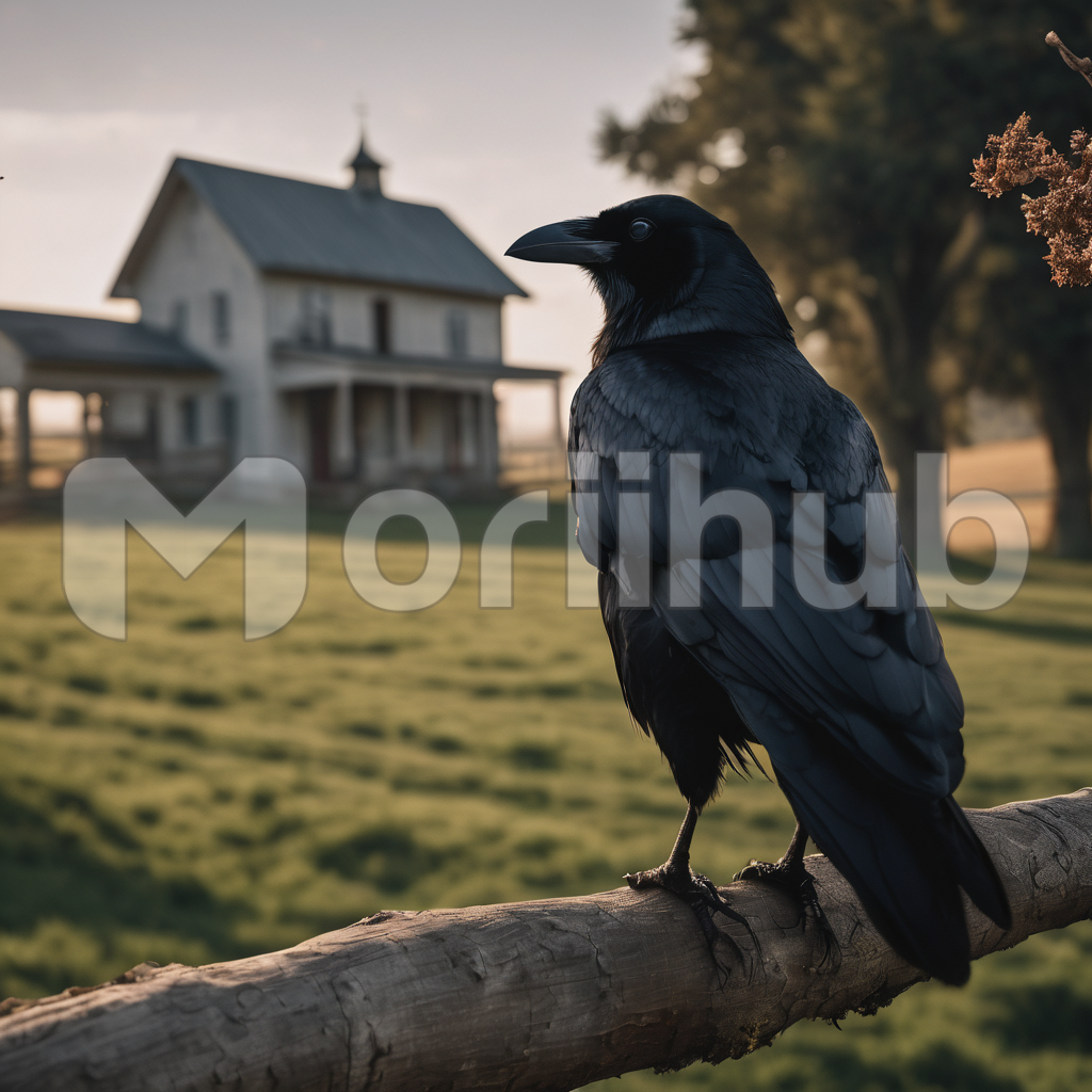 A crow perches on a branch, an ebony sentinel surveying the landscape. From its vantage point, the bird observes with keen eyes, overlooking a distant house. The silhouette of the crow against the sky adds a touch of mystery to the scene, as if it holds secrets whispered by the wind. The distant house becomes a mere backdrop to this avian observer, its presence imbued with an aura of enigmatic watchfulness.