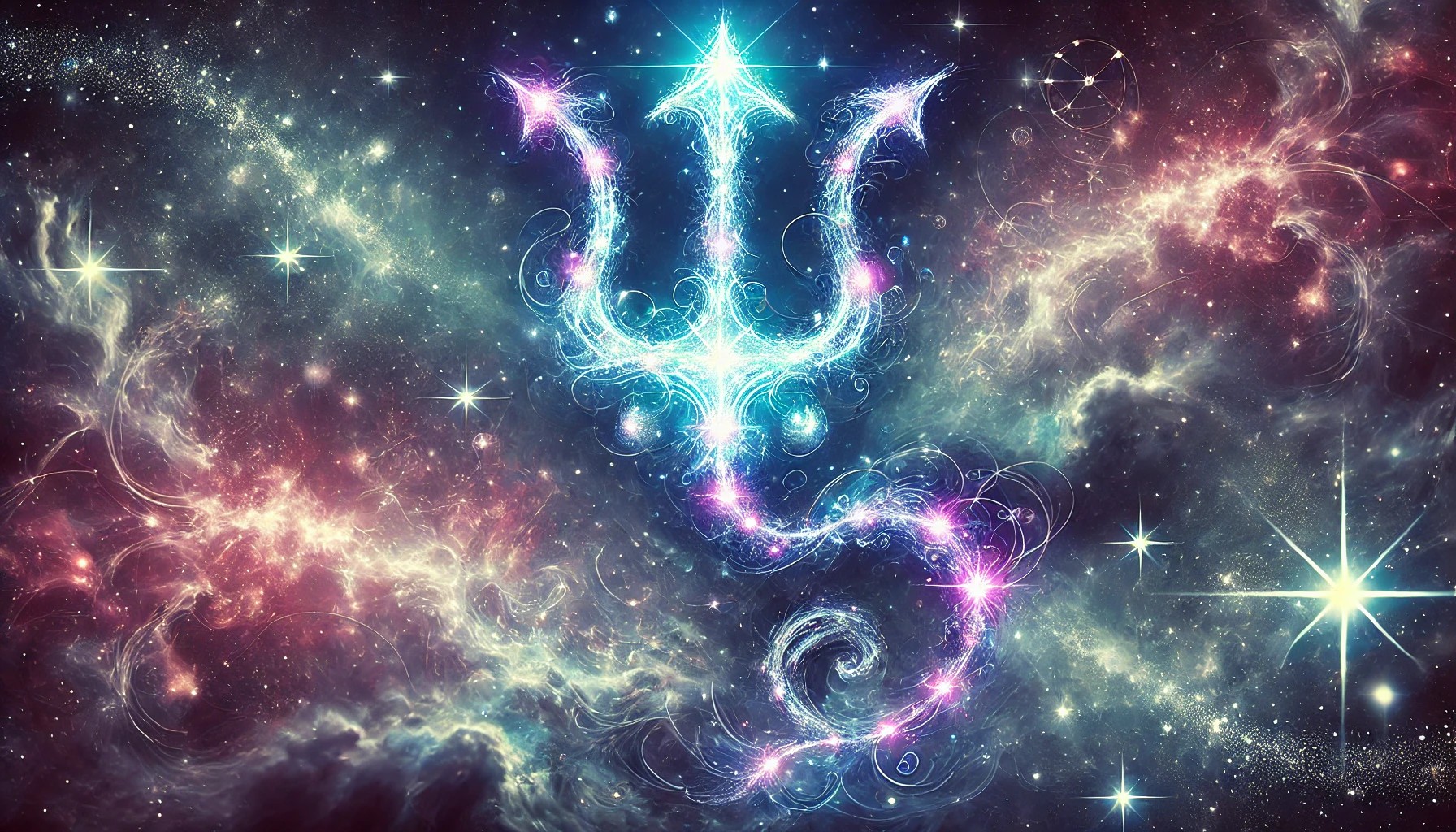 The image showcases a breathtaking celestial constellation in the shape of a trident, radiating with mystical energy. The trident is intricately formed by interconnected, glowing stars, leaving behind shimmering cosmic trails. Its aura emanates a vibrant blend of deep violet and cyan, symbolizing the mystic element.
