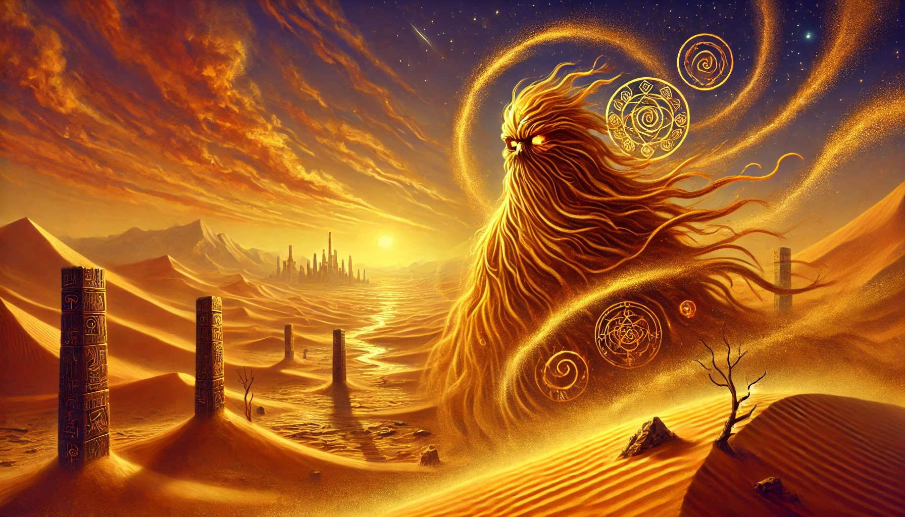 This illustration captures a mystical desert guardian rising from the swirling sands of an ancient, enchanted desert. The guardian is an immense figure composed of ever-shifting golden sand, its form constantly reshaped by the wind. Its eyes burn like embers, exuding an intense, otherworldly energy, while glowing ancient symbols drift across its body like living hieroglyphs.