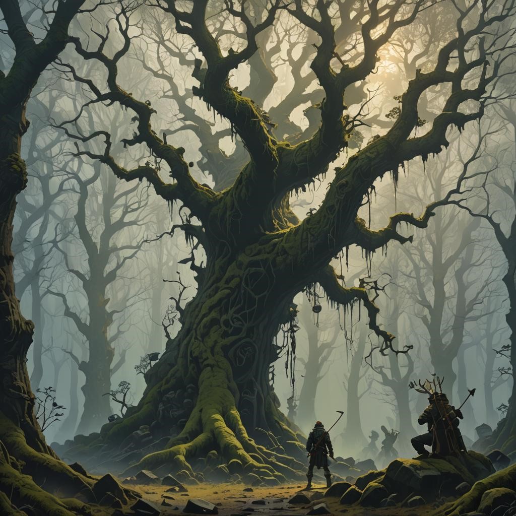 A mystical and ancient forest, bathed in a soft, diffused light that filters through the dense canopy above. The focal point of the scene is a massive, gnarled tree at the center, its thick roots sprawling across the forest floor and its twisted branches stretching high into the misty air. The tree is covered in moss and vines, giving it an ancient, almost sentient presence. The atmosphere is thick with mystery, as if the forest is alive with secrets waiting to be discovered.