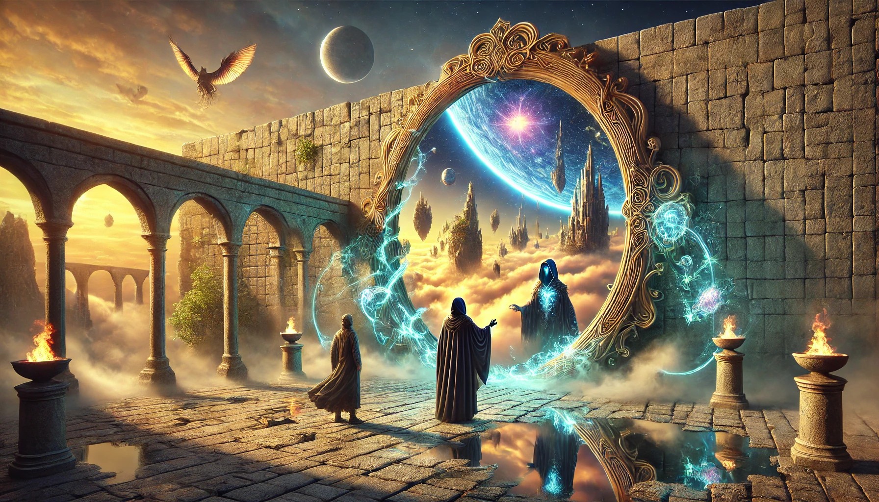 This illustration captures a surreal and thought-provoking moment where reality itself bends and fractures. In the center of an ancient stone courtyard, an ornate mystical mirror stands tall, its reflective surface rippling like liquid. A cloaked traveler gazes into the mirror, their expression filled with wonder and hesitation. But the reflection does not merely show their own image—it reveals an alternate reality.