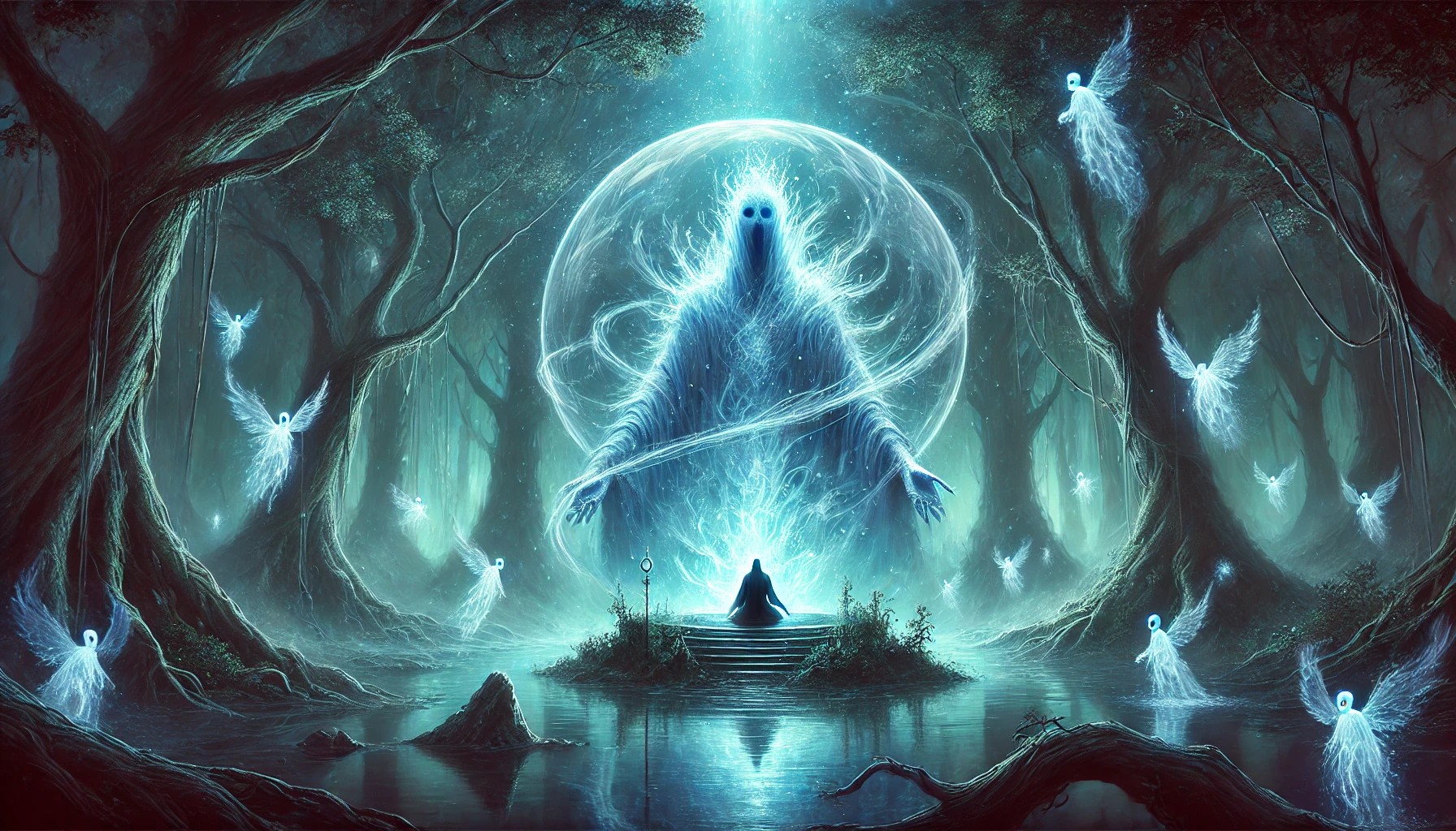 This illustration depicts a mystical soul-infused scene set in an enchanted forest. At the heart of the image, a lone figure kneels before a floating soul orb, its translucent surface swirling with luminous blue energy. The orb pulses with ancient power, releasing delicate wisps of ethereal light into the air. Emerging from within the orb is the spirit of an ancient guardian, towering over the kneeling figure with a watchful yet enigmatic presence.