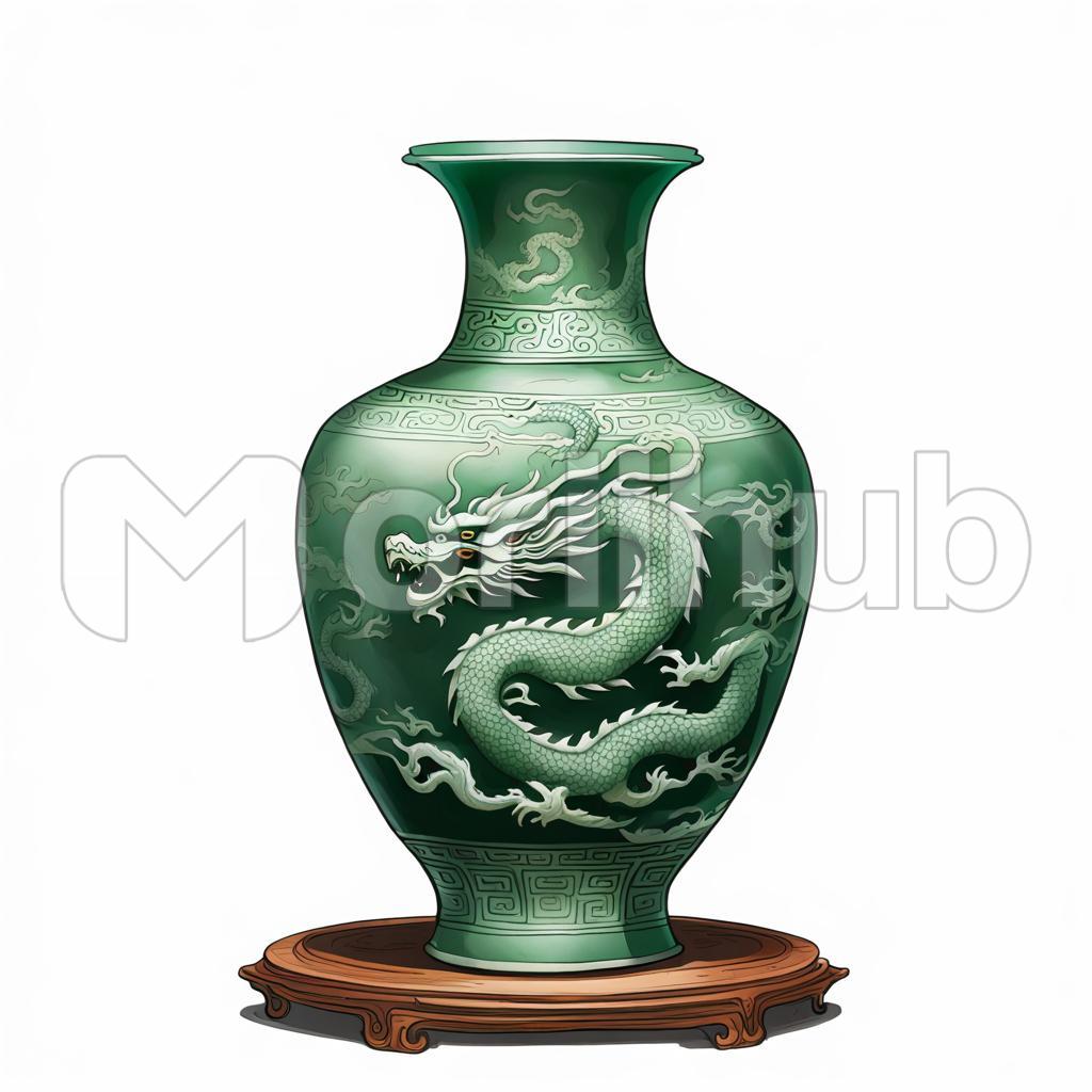 A jade vase, adorned with intricate drawings of a dragon, commands attention on its elegant stand. The emerald hues of the jade create a luxurious canvas for the detailed dragon motif, each line a testament to skilled artistry. Placed on a stand, the vase becomes a captivating centerpiece, where the mythical creature seems to come alive, adding an aura of mystique and regal charm to the space it graces.