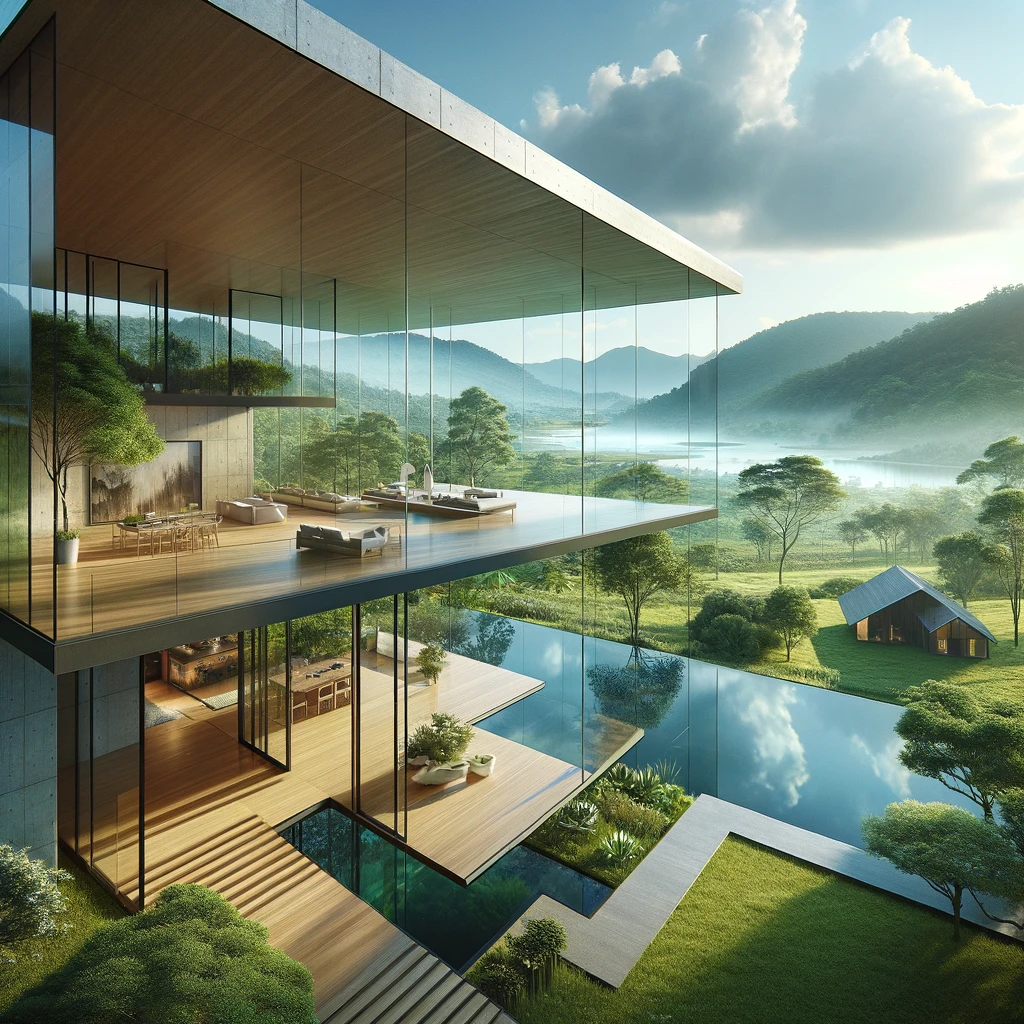 Perched amidst verdant foliage, the modern home boasts transparent glass walls that dissolve the boundary between indoor and outdoor spaces. Embraced by lush greenery, it offers a seamless connection to nature, inviting sunlight to dance through its airy interiors. Every corner celebrates the breathtaking panorama, merging contemporary luxury with natural splendor.