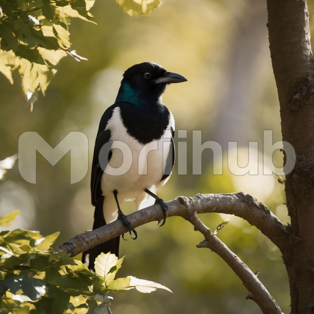A magpie with feathers of striking monochrome elegance perches on a branch, its white and black plumage creating a mesmerizing contrast. Against the backdrop of autumn leaves, the bird’s refined silhouette becomes a natural masterpiece. Each feather is a delicate stroke in nature’s artistry, blending seamlessly with the foliage. The magpie’s poised presence on the branch, surrounded by the vibrant hues of fall, adds a timeless allure to this picturesque avian tableau.