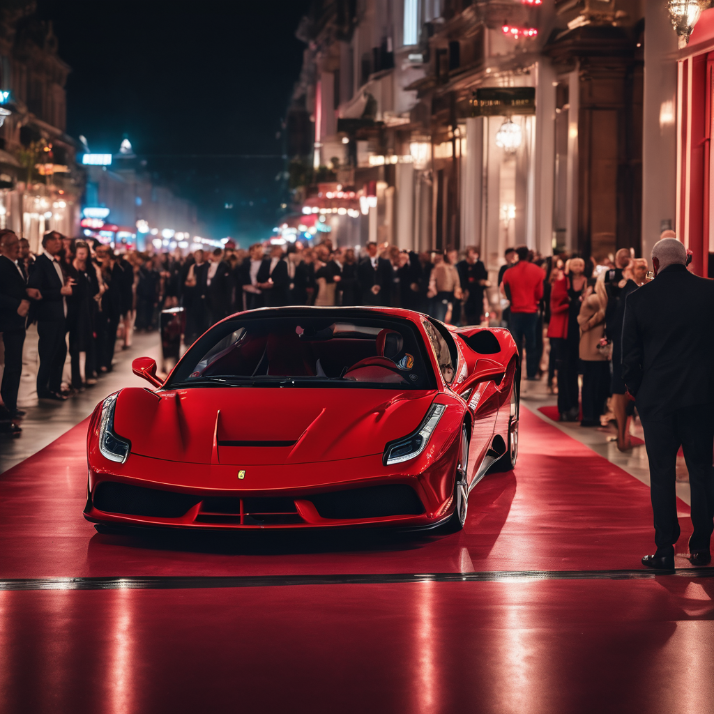 A sleek red car glides gracefully along the glistening road, its polished exterior reflecting the city’s neon glow. In the backdrop of the night, people bustle about, their figures illuminated by the soft radiance of streetlights and the cityscape. The car’s presence commands attention as it navigates through the urban landscape, a symbol of modern elegance amidst the bustling nocturnal activity of the city.