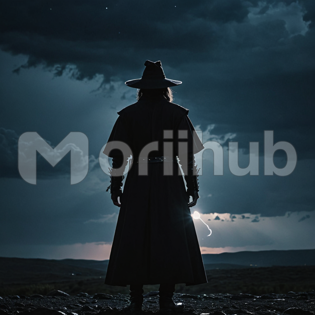 On a stormy night, a man stands, his back facing the viewer, clad in a trench coat and hat. His silhouette speaks of mystery, a lone figure braving the elements. Against the backdrop of the tempestuous night, his presence evokes a sense of intrigue and resilience, embodying the enigmatic allure of a noir protagonist.