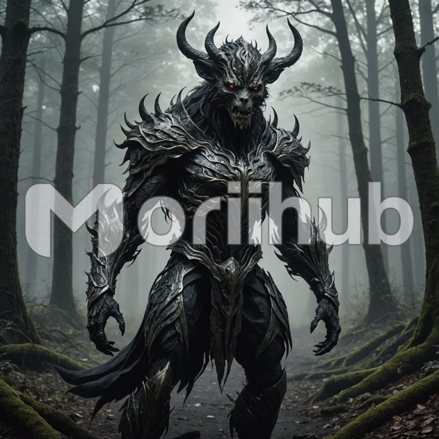 In the heart of a dark, eerie forest stands a demonic creature, its silhouette imposing against the shadows. Four twisted horns jut from its head, a testament to its otherworldly nature. Its eyes gleam with an unsettling glow, reflecting the faint moonlight that filters through the dense canopy above. Sinewy muscles ripple beneath its dark, scaled skin, hinting at formidable strength. The creature stands motionless, blending with the gnarled trees and tangled undergrowth, exuding an aura of malevolence that sends shivers through the surrounding gloom.