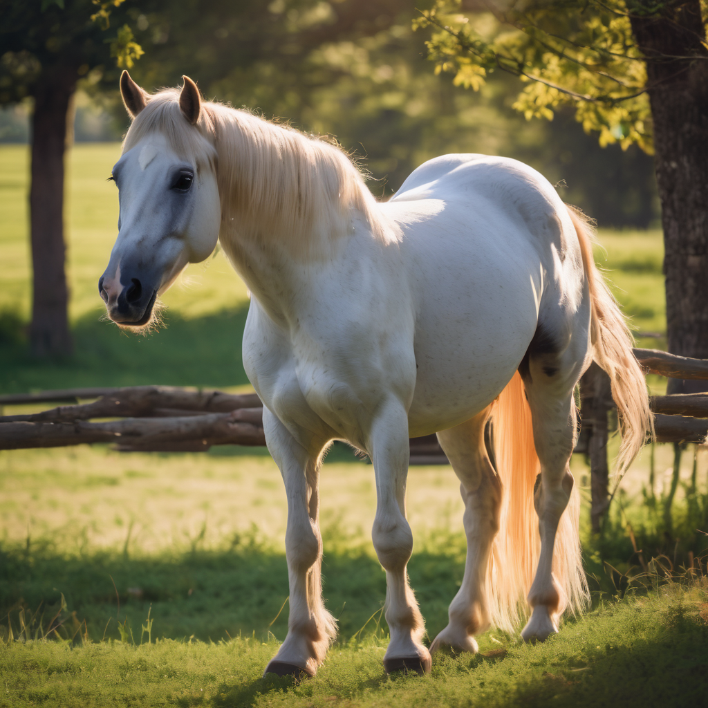A majestic horse grazes in a serene farm setting. Its sleek coat glows in the sunlight, embodying strength and grace. Beyond, a sturdy wooden fence stands, weathered by time, adding rustic charm to the scene. A lone tree, its branches reaching skyward, graces the corner, casting a gentle shadow. Together, these elements create a picturesque tableau of rural tranquility, where nature and simplicity harmonize in the timeless beauty of a countryside moment.