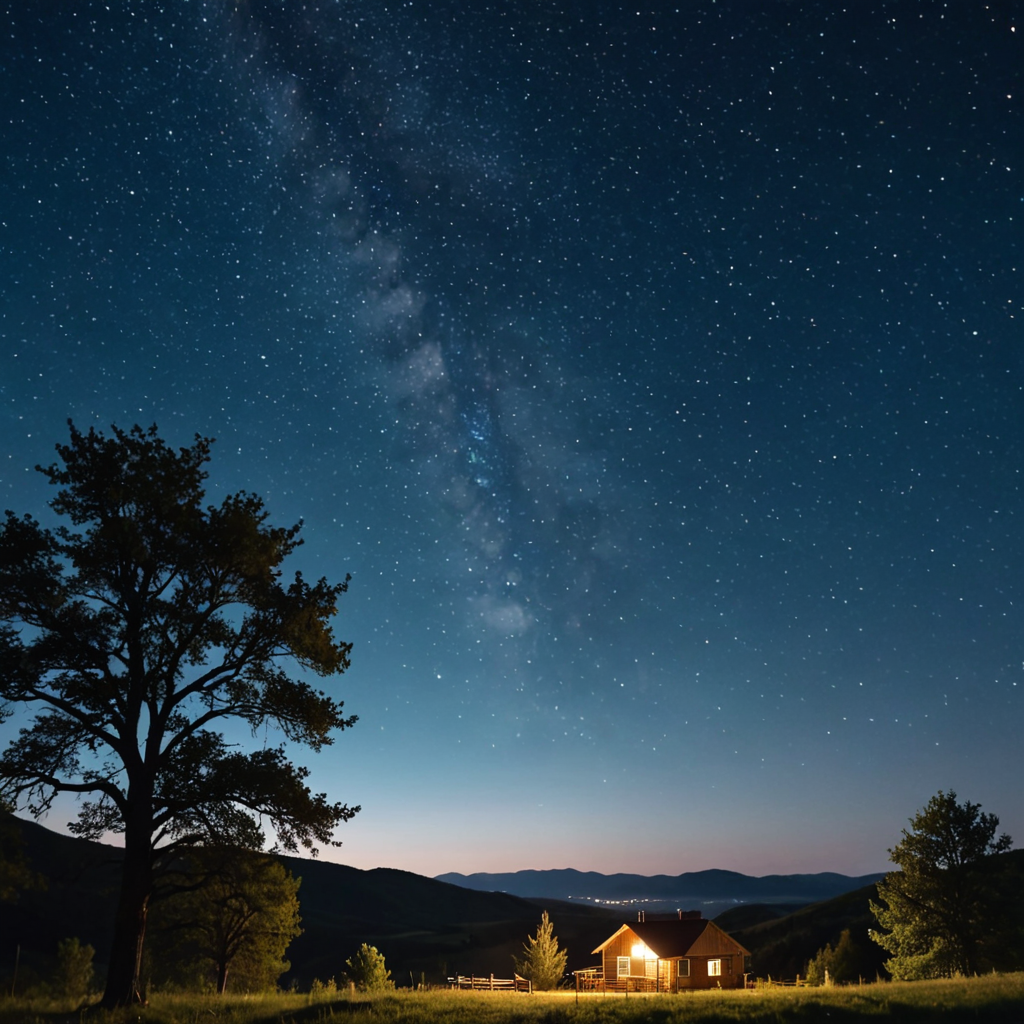 Under the vast expanse of the night sky, stars twinkle like distant beacons, casting a soft glow over the tranquil field below. In the distance, the warm glow of lights emanates from a solitary house, a beacon of civilization amidst the darkness. The serene beauty of the landscape is amplified by the peaceful silence of the night, creating a scene of quiet contemplation and awe-inspiring wonder.