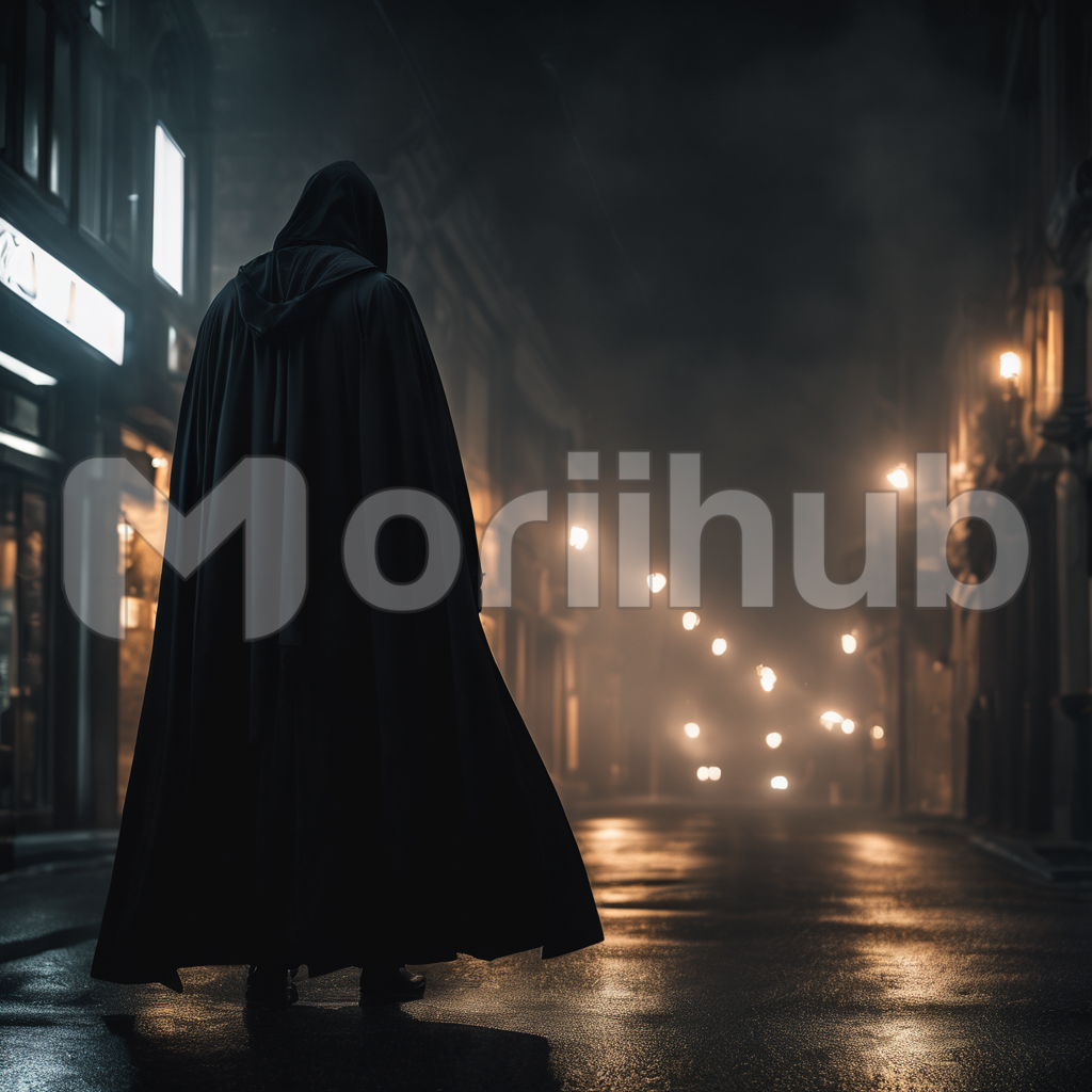 In the hushed stillness of the empty street at night, a solitary figure stands, cloaked in darkness. Their profile, silhouetted against the dim glow of distant streetlights, exudes an air of mystery and intrigue. The cloak drapes around them, obscuring their features and blending seamlessly with the shadows. It’s a scene of eerie quietude, where the lone figure embodies the enigmatic essence of the nocturnal streetscape, shrouded in secrets and uncertainty.