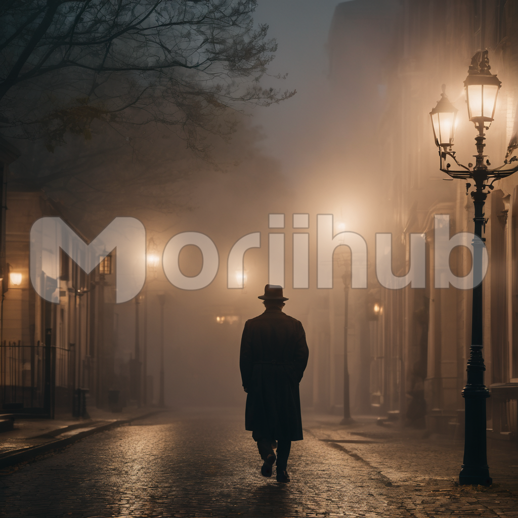 In the embrace of night’s mystery, a man strides through the mist-shrouded street, cloaked in a trench coat. Lamps cast a soft glow, painting the mist with an ethereal hue. The street’s silence is broken only by the echoing footsteps. The man’s silhouette, obscured yet commanding, embodies a noir aesthetic as he navigates the enigmatic mist. The misty street becomes a cinematic backdrop, unfolding a tale of solitude and intrigue in the cloak of darkness.