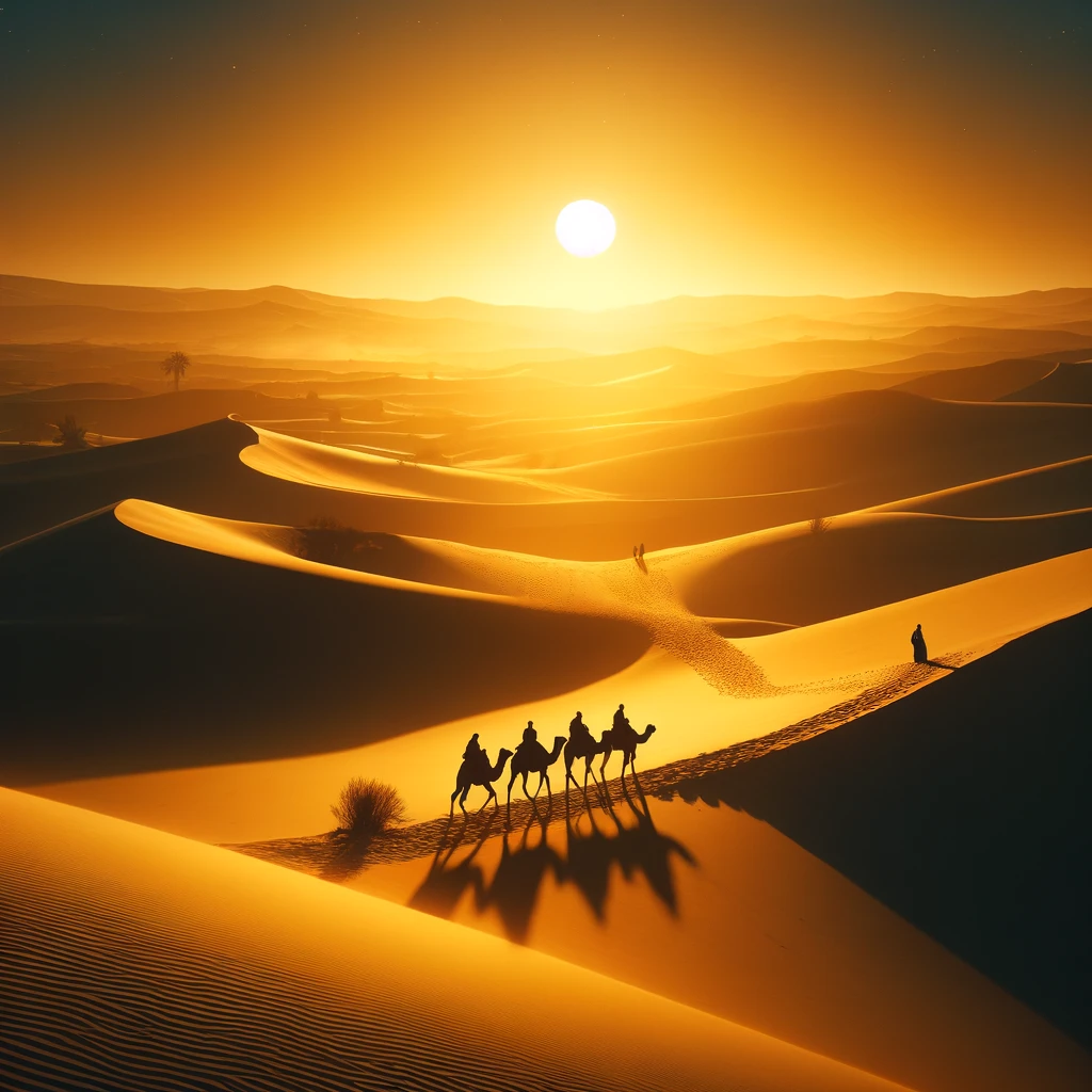 In the tranquil embrace of the desert, three travelers pressed on, their silhouettes etched against the canvas of shifting sands. As the sun descended, casting a golden glow over the dunes, a sense of tranquility enveloped them. Each step resonated with quiet determination, forging a path through the timeless expanse.