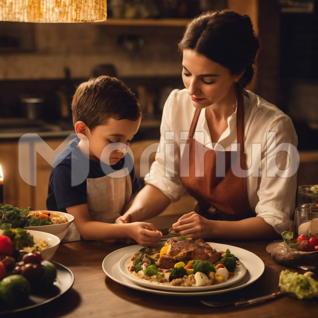 In a heartwarming scene, a nurturing mother sits beside her young son, a tableau of love and care. With tenderness, she spoon-feeds him a wholesome meal, her eyes reflecting maternal warmth. The atmosphere resonates with the comforting sounds of shared laughter and the joy of nourishing bonds that transcend mere sustenance.