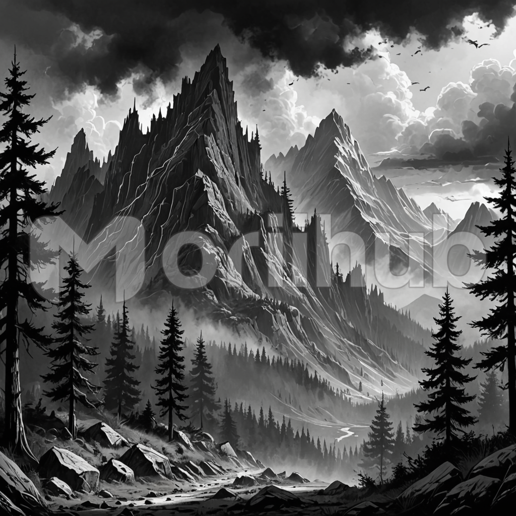 A looming, eerie mountain rises sinisterly against the darkened sky, its jagged silhouette etched in shadows. Enshrouded by ominous clouds, it exudes an aura of foreboding, as if harboring ancient secrets within its craggy depths. The air is heavy with a palpable sense of unease, and the landscape seems to whisper tales of forgotten mysteries. In the gloom, the mountain stands as a formidable sentinel, casting a haunting presence over the desolate terrain, a silent witness to the passage of time.