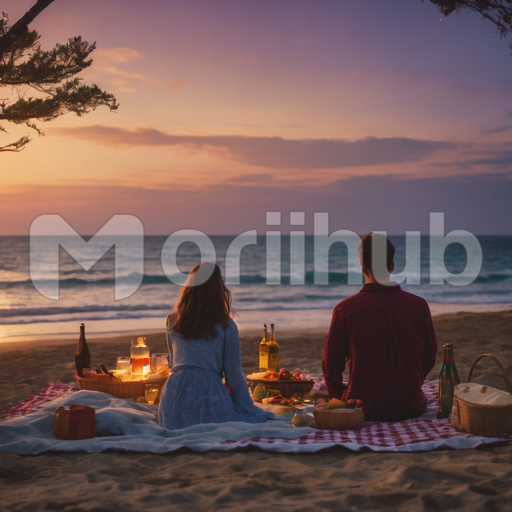 Beneath a twilight sky, a couple shares a serene beachfront picnic, waves whispering tales beside them. The golden sun bids adieu, casting hues of orange and pink on the tranquil ocean. The couple, silhouetted against the tranquil horizon, savor moments in the soft glow, surrounded by the symphony of the sea, creating a timeless tableau of romance by the shore.