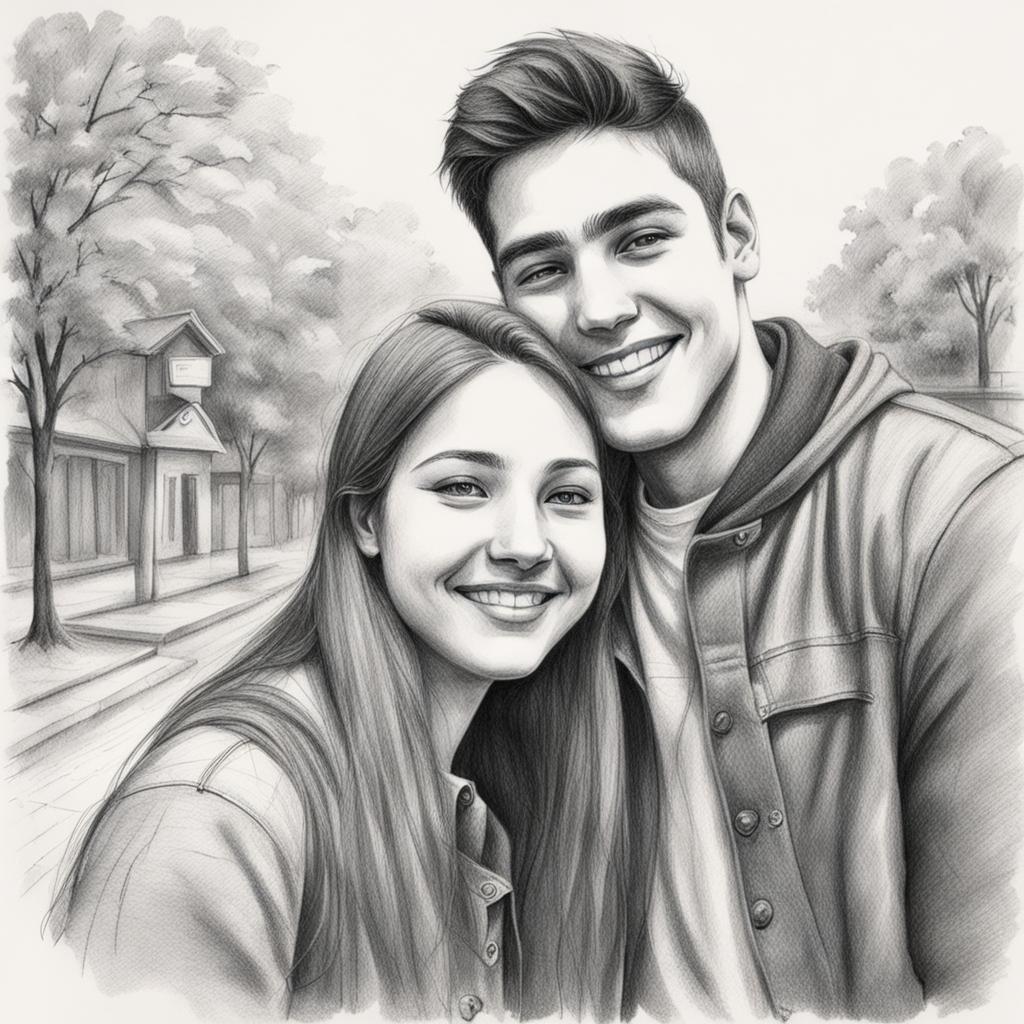 In the soft graphite lines of a pencil sketch, a teenage couple smiles, their gaze fixed ahead with hopeful anticipation. With eyes sparkling and lips curved upwards, they radiate youthful exuberance and determination. Each line etched on the paper portrays their connection and resolve, a snapshot of their shared dreams and aspirations. As they look towards the future, their smiles speak of endless possibilities and the excitement of the journey ahead.