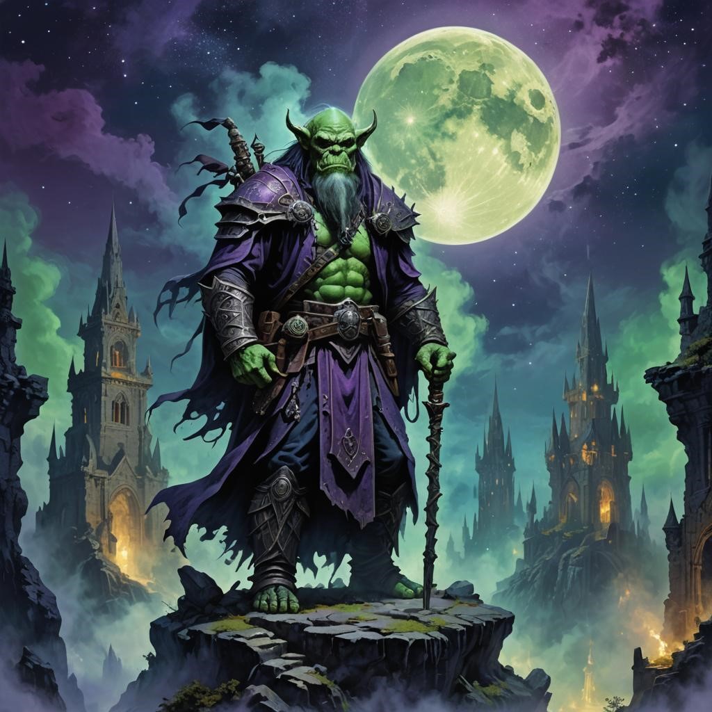 A powerful orc sorcerer standing confidently atop a craggy outcrop under the eerie light of a full moon. The orc, with his green skin and muscular build, exudes both physical strength and mystical power. His face is stern, with sharp, pointed ears and a long, flowing beard that adds to his aura of wisdom and age. His glowing, pale green eyes seem to pierce through the darkness, reflecting his deep connection with the arcane.
